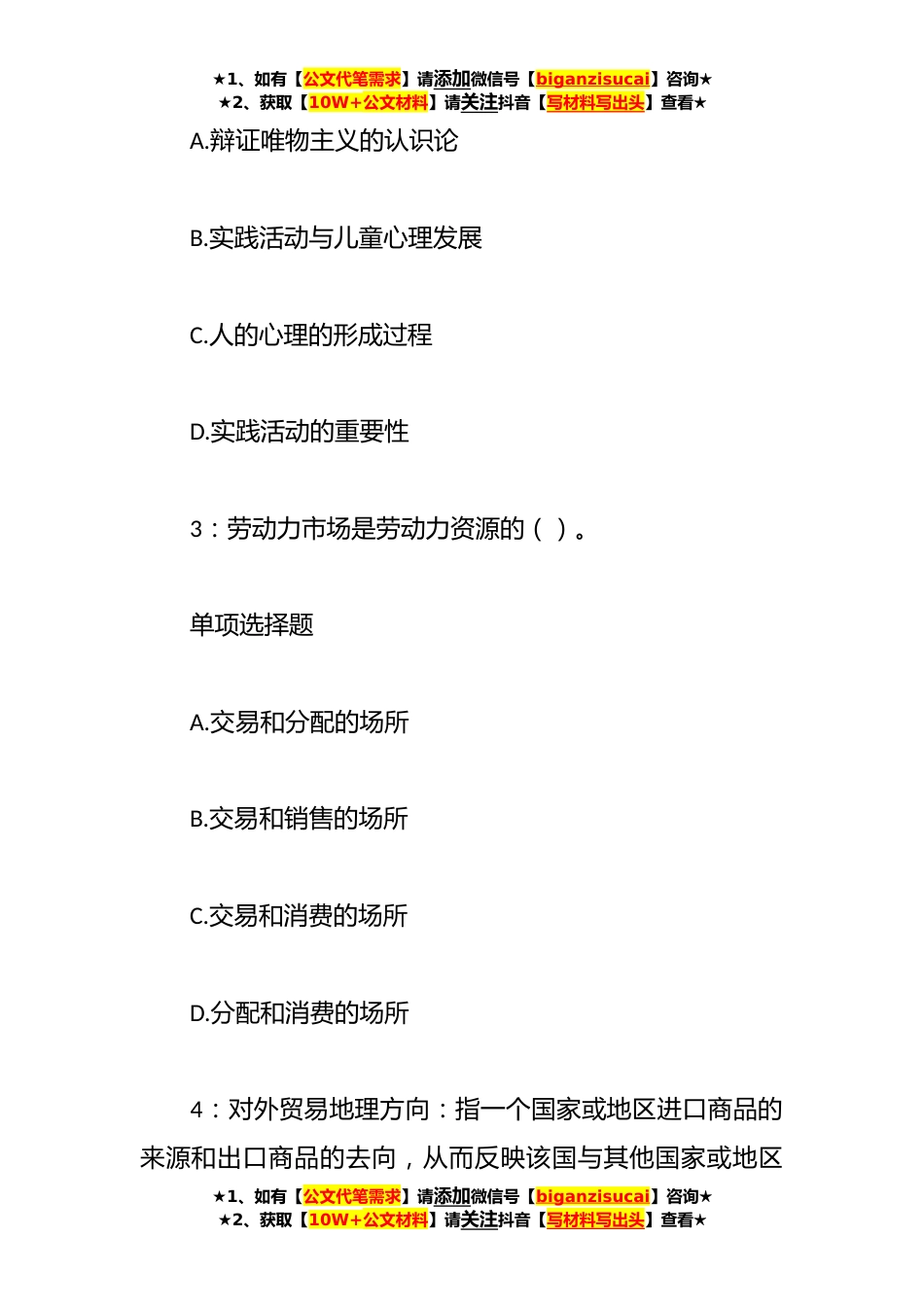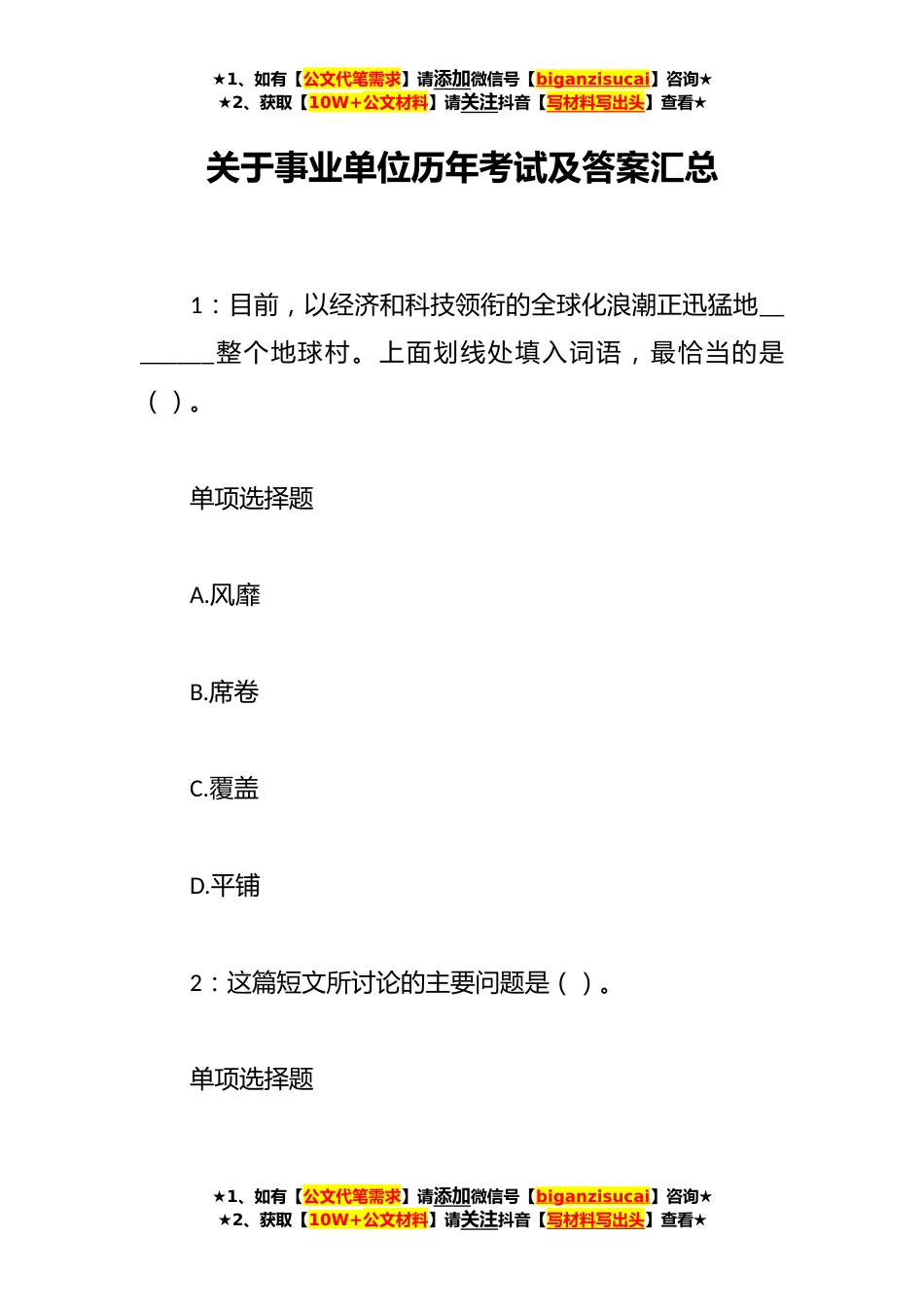 ★1、如有【公文代笔需求】请添加微信号【biganzisucai】咨询★★2、获取【10W+公文材料】请关注抖音【写材料写出头】查看★关于事业单位历年考试及答案汇总1:目前,以经济和科技领衔的全球化浪潮正迅猛地________整个地球村。上面划线处填入词语,最恰当的是()。单项选择题A.风靡B.席卷C.覆盖D.平铺2:这篇短文所讨论的主要问题是()。单项选择题★1、如有【公文代笔需求】请添加微信号【biganzisucai】咨询★★2、获取【10W+公文材料】请关注抖音【写材料写出头】查看★★1、如有【公文代笔需求】请添加微信号【biganzisucai】咨询★★2、获取【10W+公文材料】请关注抖音【写材料写出头】查看★A.辩证唯物主义的认识论B.实践活动与儿童心理发展C.人的心理的形成过程D.实践活动的重要性3:劳动力市场是劳动力...