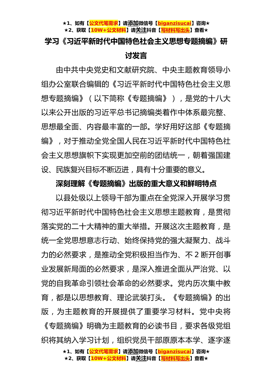 ★1、如有【公文代笔需求】请添加微信号【biganzisucai】咨询★★2、获取【10W+公文材料】请关注抖音【写材料写出头】查看★学习《习近平新时代中国特色社会主义思想专题摘编》研讨发言由中共中央党史和文献研究院、中央主题教育领导小组办公室联合编辑的《习近平新时代中国特色社会主义思想专题摘编》(以下简称《专题摘编》),是党的十八大以来公开出版的习近平总书记摘编类着作中体系最完整、思想最全面、内容最丰富的一部。学好用好这部《专题摘编》,对于推动全党全国人民在习近平新时代中国特色社会主义思想旗帜下实现更加空前的团结统一,朝着强国建设、民族复兴目标不断迈进,具有十分重要的意义。深刻理解《专题摘编》出版的重大意义和鲜明特点以县处级以上领导干部为重点在全党深入开展学习贯彻习近平...