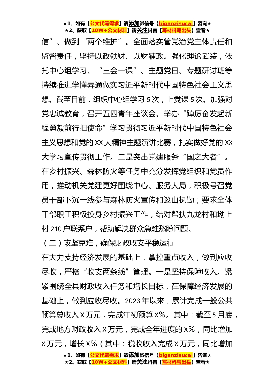 ★1、如有【公文代笔需求】请添加微信号【biganzisucai】咨询★★2、获取【10W+公文材料】请关注抖音【写材料写出头】查看★2023年上半年某县财政局财政工作情况报告今年以来,在县委、县政府的正确领导下,我局坚持以党的XX大精神、习近平新时代中国特色社会主义思想为引领,认真贯彻落实全省、全市财政工作会议精神,积极稳妥应对矛盾错综复杂、挑战机遇交织的经济财政形势,坚持稳中求进的工作基调,全面落实“三高四新”战略定位和使命任务,做好打好发展“六仗”相关工作,不断加强财政资源统筹和优化支出结构,全面落实党政机关过“紧日子”要求,各项工作稳步推进。现报告如下:一、2023年上半年财政工作情况(一)党建引领,推进党建财政融合发展我们始终坚持以党的政治建设为统领,落实全面从严治党战略...
