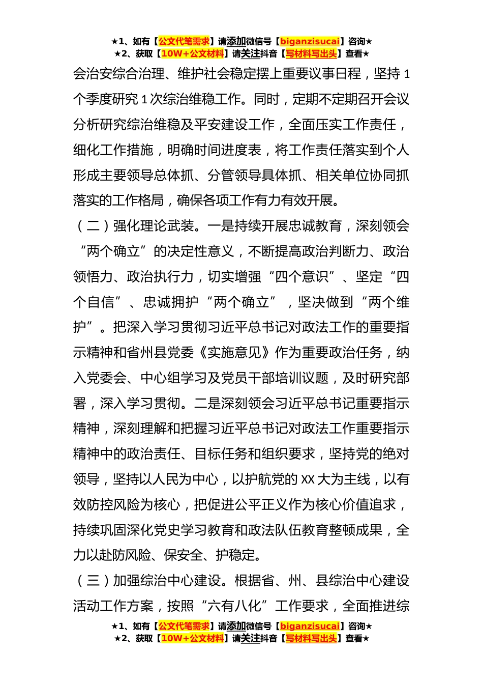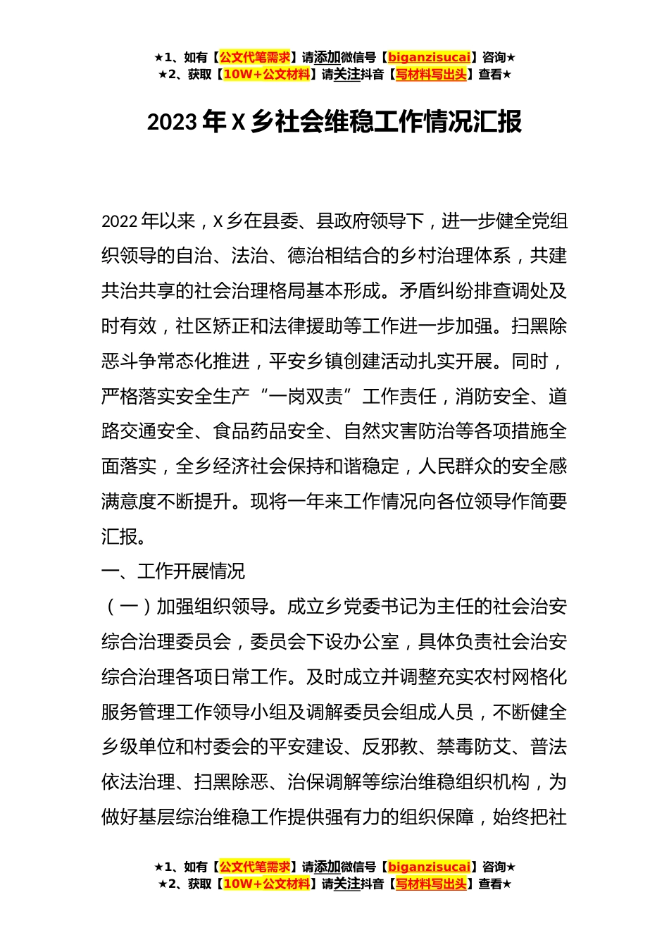 ★1、如有【公文代笔需求】请添加微信号【biganzisucai】咨询★★2、获取【10W+公文材料】请关注抖音【写材料写出头】查看★2023年X乡社会维稳工作情况汇报2022年以来,X乡在县委、县政府领导下,进一步健全党组织领导的自治、法治、德治相结合的乡村治理体系,共建共治共享的社会治理格局基本形成。矛盾纠纷排查调处及时有效,社区矫正和法律援助等工作进一步加强。扫黑除恶斗争常态化推进,平安乡镇创建活动扎实开展。同时,严格落实安全生产“一岗双责”工作责任,消防安全、道路交通安全、食品药品安全、自然灾害防治等各项措施全面落实,全乡经济社会保持和谐稳定,人民群众的安全感满意度不断提升。现将一年来工作情况向各位领导作简要汇报。一、工作开展情况(一)加强组织领导。成立乡党委书记为主任的社...
