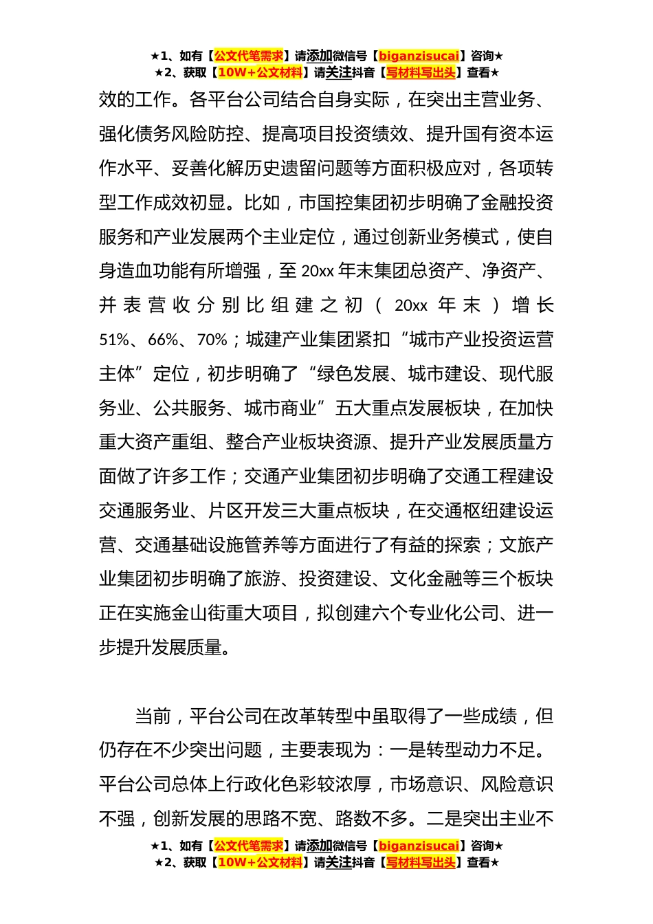★1、如有【公文代笔需求】请添加微信号【biganzisucai】咨询★★2、获取【10W+公文材料】请关注抖音【写材料写出头】查看★XX集团企业公司关于坚持市场化方向全力推进平台公司改革转型的建议(2篇)篇(1)新时代背景下,平台公司如何通过深化改革卸下包袱开辟新路,对于实施产业强市战略、推动我市经济社会高质量发展具有重大意义。为此,市政协经济科技委员会会同民建市委会成立专题调研组,赴市国资委和各平台公司走访调研。x月x日,市政协召开x届x次常委会议,就“推进我市平台公司改革转型”进行了专题议政。常委会议认为,近年来,市委、市政府高度重视平台公司改革转型,高点定位,科学谋划,务实推进。市国资委作为职能部门,推出一系列重要举措,做了大量富有成★1、如有【公文代笔需求】请添加微信号【...