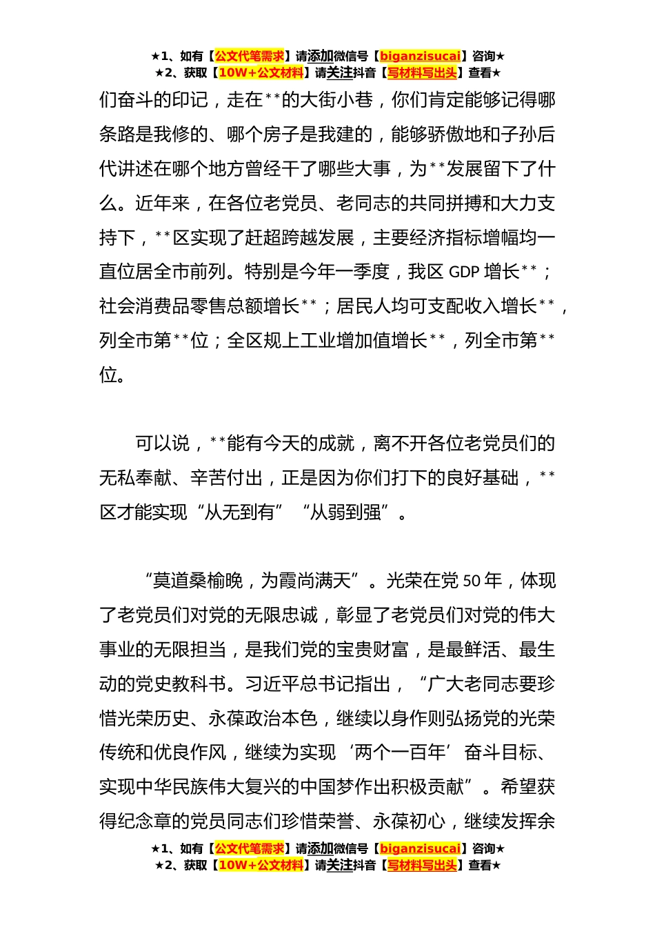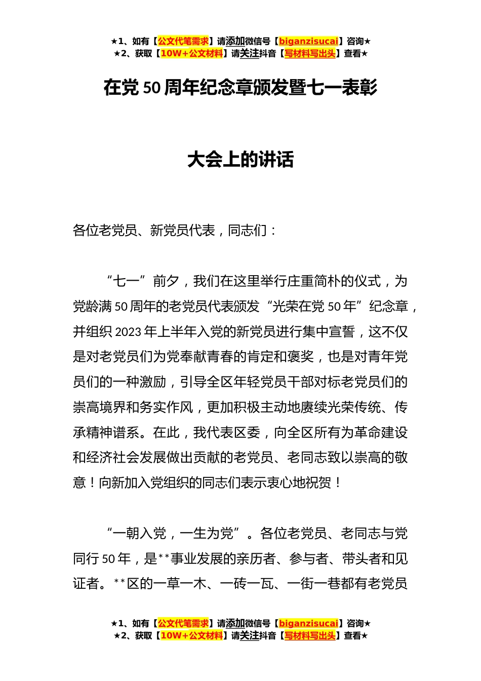 ★1、如有【公文代笔需求】请添加微信号【biganzisucai】咨询★★2、获取【10W+公文材料】请关注抖音【写材料写出头】查看★在党50周年纪念章颁发暨七一表彰大会上的讲话各位老党员、新党员代表,同志们:“七一”前夕,我们在这里举行庄重简朴的仪式,为党龄满50周年的老党员代表颁发“光荣在党50年”纪念章,并组织2023年上半年入党的新党员进行集中宣誓,这不仅是对老党员们为党奉献青春的肯定和褒奖,也是对青年党员们的一种激励,引导全区年轻党员干部对标老党员们的崇高境界和务实作风,更加积极主动地赓续光荣传统、传承精神谱系。在此,我代表区委,向全区所有为革命建设和经济社会发展做出贡献的老党员、老同志致以崇高的敬意!向新加入党组织的同志们表示衷心地祝贺!“一朝入党,一生为党”。各位老党...