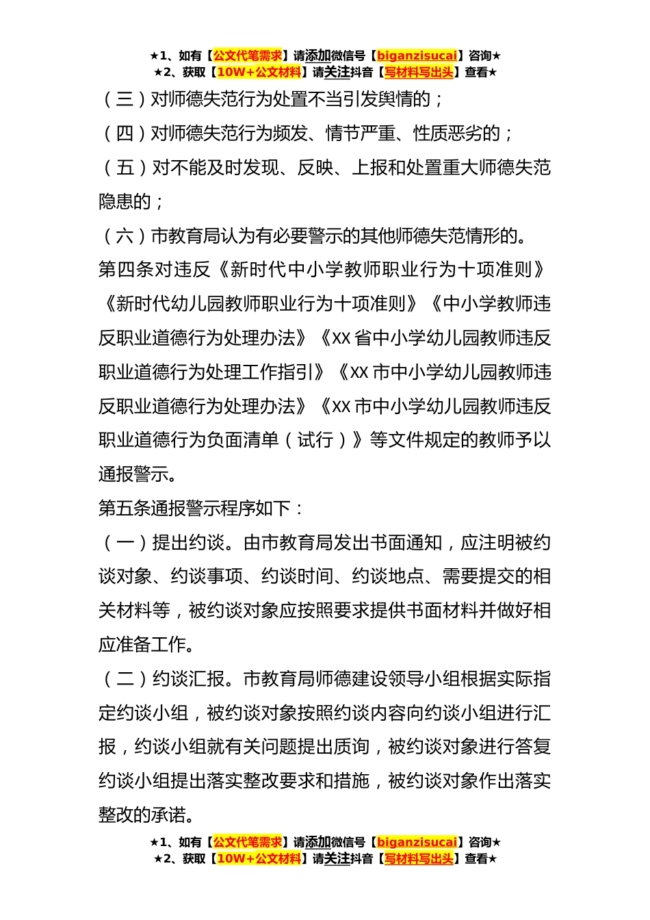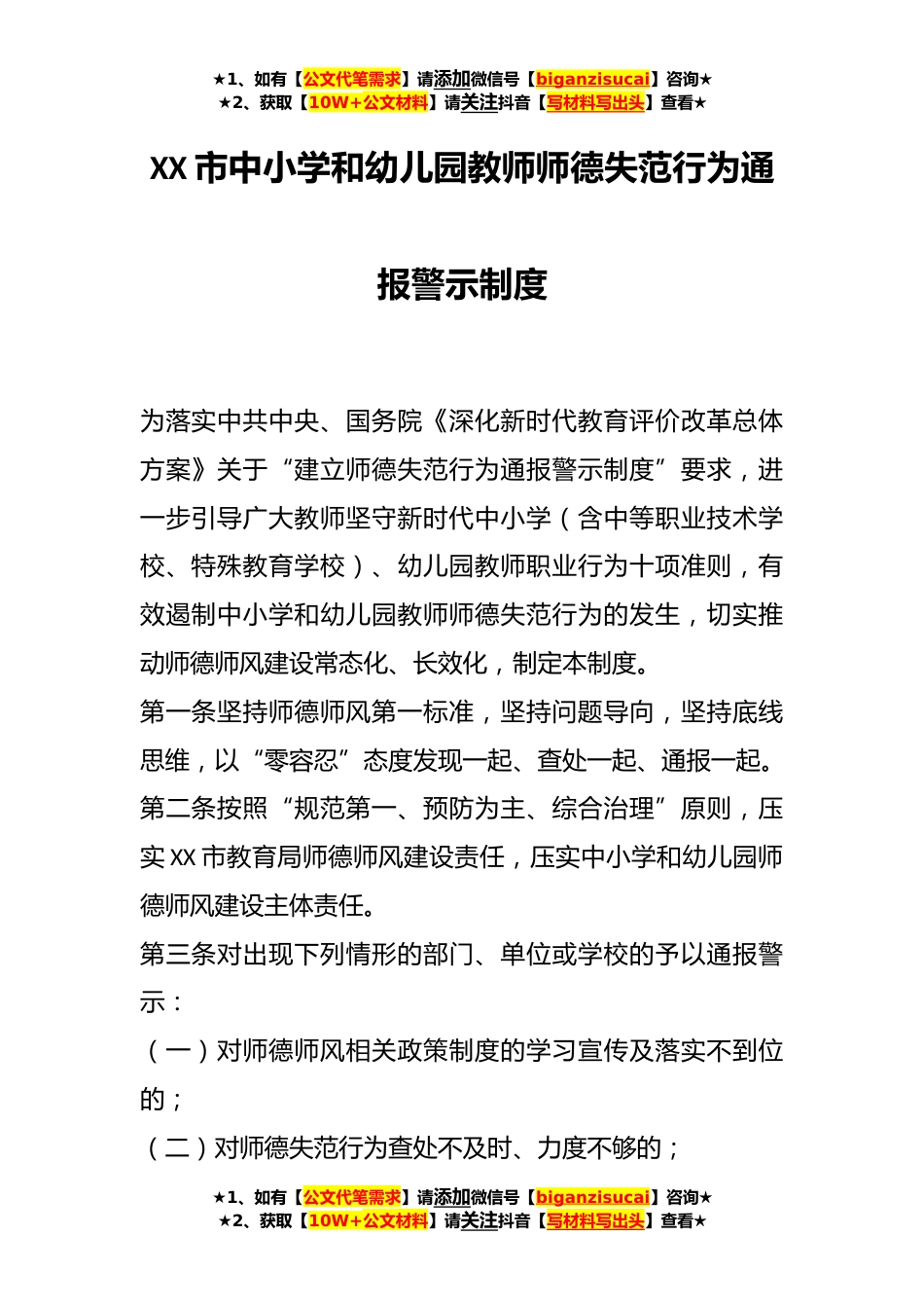 ★1、如有【公文代笔需求】请添加微信号【biganzisucai】咨询★★2、获取【10W+公文材料】请关注抖音【写材料写出头】查看★XX市中小学和幼儿园教师师德失范行为通报警示制度为落实中共中央、国务院《深化新时代教育评价改革总体方案》关于“建立师德失范行为通报警示制度”要求,进一步引导广大教师坚守新时代中小学(含中等职业技术学校、特殊教育学校)、幼儿园教师职业行为十项准则,有效遏制中小学和幼儿园教师师德失范行为的发生,切实推动师德师风建设常态化、长效化,制定本制度。第一条坚持师德师风第一标准,坚持问题导向,坚持底线思维,以“零容忍”态度发现一起、查处一起、通报一起。第二条按照“规范第一、预防为主、综合治理”原则,压实XX市教育局师德师风建设责任,压实中小学和幼儿园师德师风...