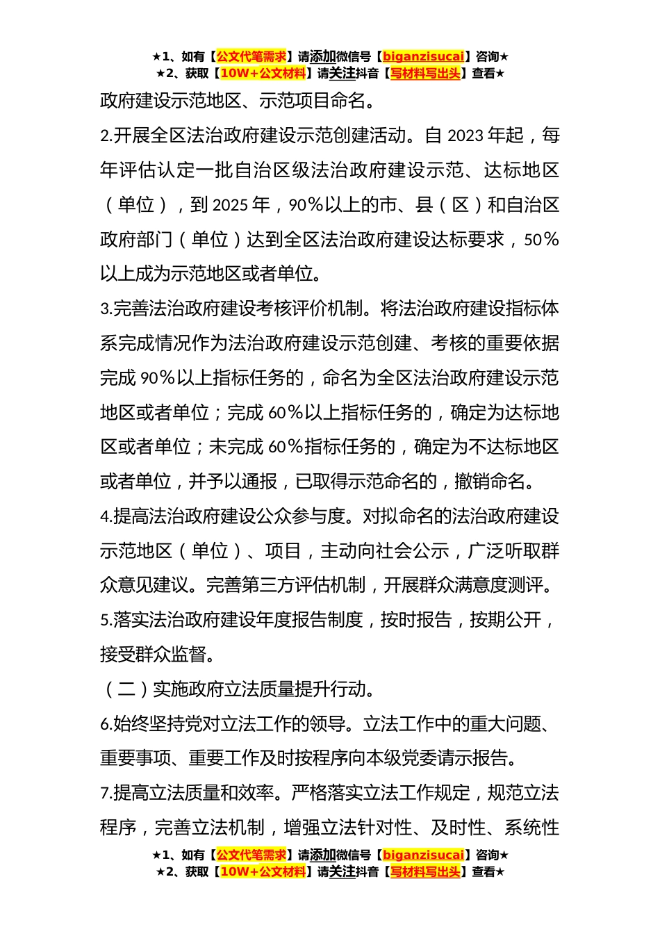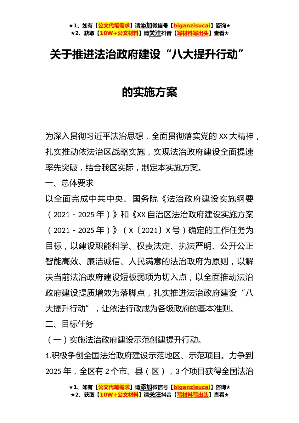 ★1、如有【公文代笔需求】请添加微信号【biganzisucai】咨询★★2、获取【10W+公文材料】请关注抖音【写材料写出头】查看★关于推进法治政府建设“八大提升行动”的实施方案为深入贯彻习近平法治思想,全面贯彻落实党的XX大精神,扎实推动依法治区战略实施,实现法治政府建设全面提速率先突破,结合我区实际,制定本实施方案。一、总体要求以全面完成中共中央、国务院《法治政府建设实施纲要(2021-2025年)》和《XX自治区法治政府建设实施方案(2021-2025年)》(X〔2021〕X号)确定的工作任务为目标,以建设职能科学、权责法定、执法严明、公开公正智能高效、廉洁诚信、人民满意的法治政府为原则,以解决当前法治政府建设短板弱项为切入点,以全面推动法治政府建设提质增效为落脚点,扎实推进法治政府建设“...