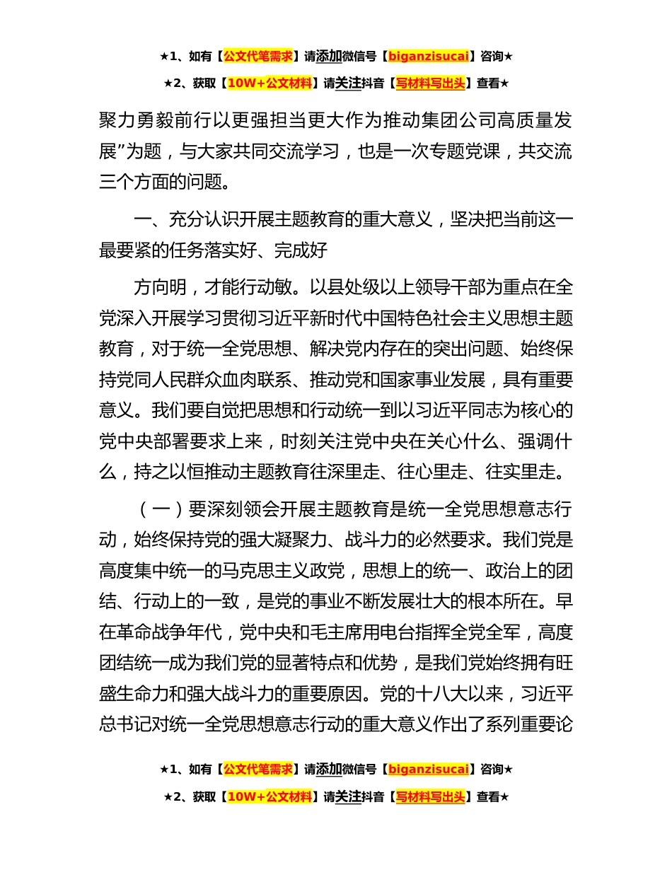 ★1、如有【公文代笔需求】请添加微信号【biganzisucai】咨询★★2、获取【10W+公文材料】请关注抖音【写材料写出头】查看★党课:凝心聚力勇毅前行以更强担当更大作不断推动集团公司高质量发展同志们:在全党深入开展学习贯彻习近平新时代中国特色社会主义思想主题教育,是以习近平同志为核心的党中央全面贯彻党的二十大精神、动员全党同志为完成党的中心任务而团结奋斗所作的重大部署,是深入推进新时代党的建设新的伟大工程的重大部署。主题教育开展以来,集团公司党委深刻领会开展主题教育的重大意义,全面把握主题教育的总要求、根本任务、目标要求、重要内容和工作安排,坚持把开展主题教育同深入贯彻落实习近平总书记关于乡村振兴发展一系列重要讲话指示批示精神结合起来,同推动集团公司各项工作落实结合...