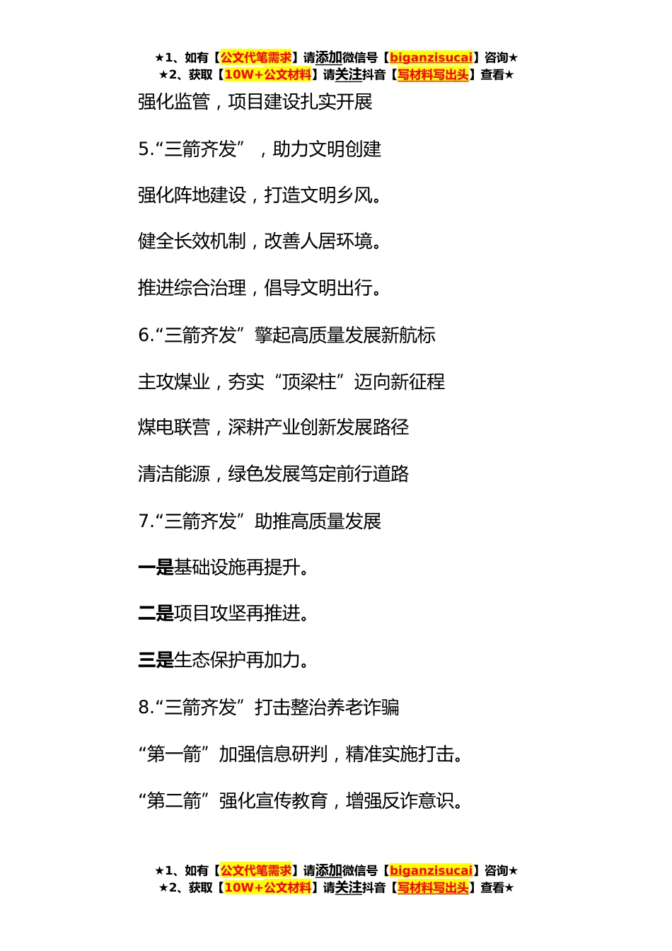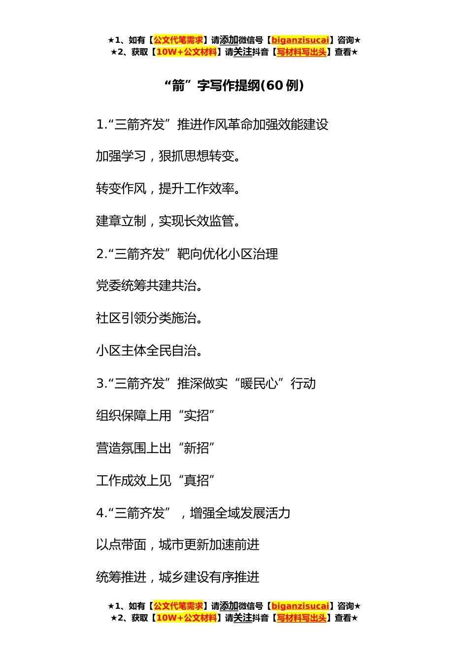 ★1、如有【公文代笔需求】请添加微信号【biganzisucai】咨询★★2、获取【10W+公文材料】请关注抖音【写材料写出头】查看★“箭”字写作提纲(60例)1.“三箭齐发”推进作风革命加强效能建设加强学习,狠抓思想转变。转变作风,提升工作效率。建章立制,实现长效监管。2.“三箭齐发”靶向优化小区治理党委统筹共建共治。社区引领分类施治。小区主体全民自治。3.“三箭齐发”推深做实“暖民心”行动组织保障上用“实招”营造氛围上出“新招”工作成效上见“真招”4.“三箭齐发”,增强全域发展活力以点带面,城市更新加速前进统筹推进,城乡建设有序推进★1、如有【公文代笔需求】请添加微信号【biganzisucai】咨询★★2、获取【10W+公文材料】请关注抖音【写材料写出头】查看★★1、如有【公文代笔需求】请添加微信...