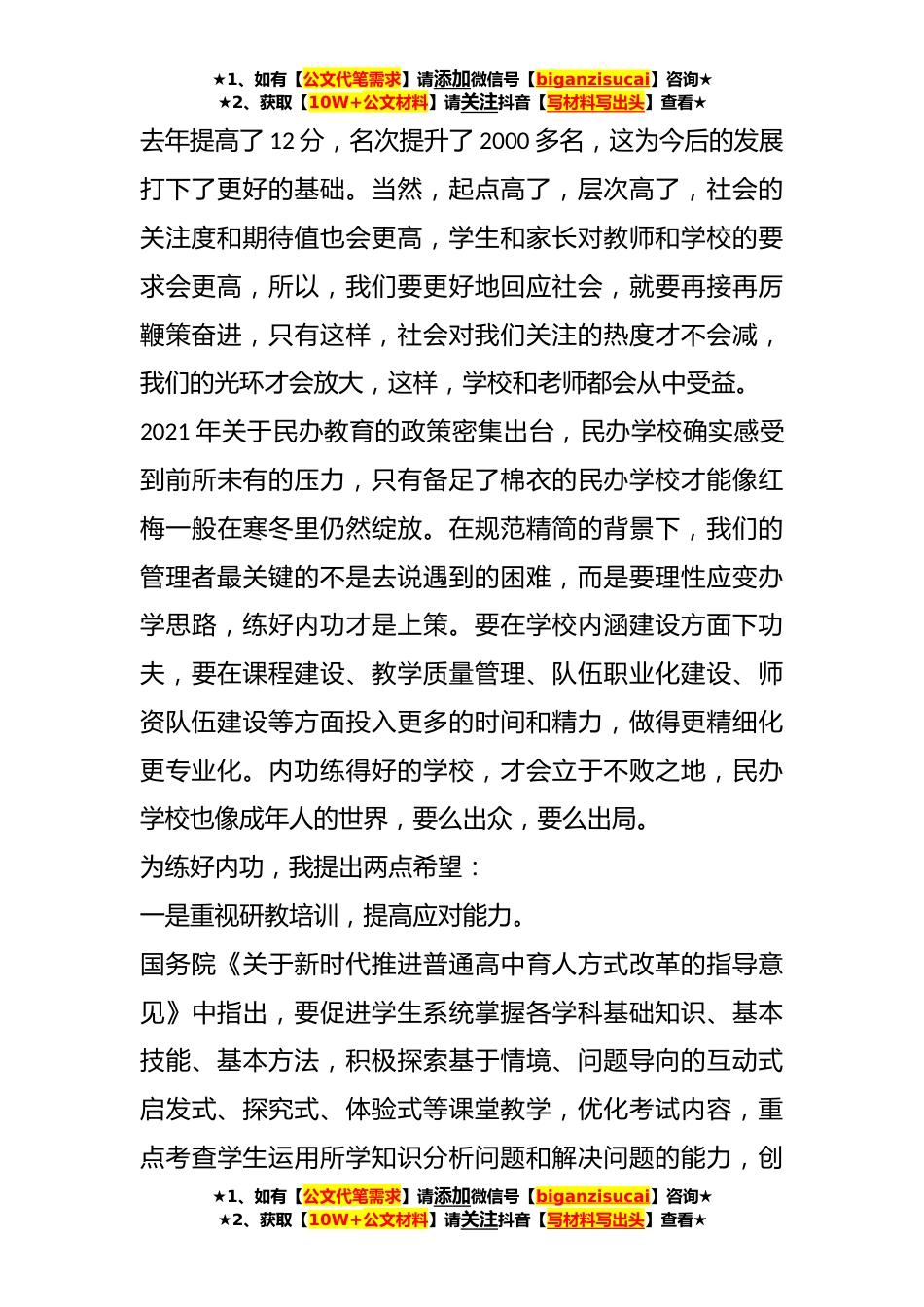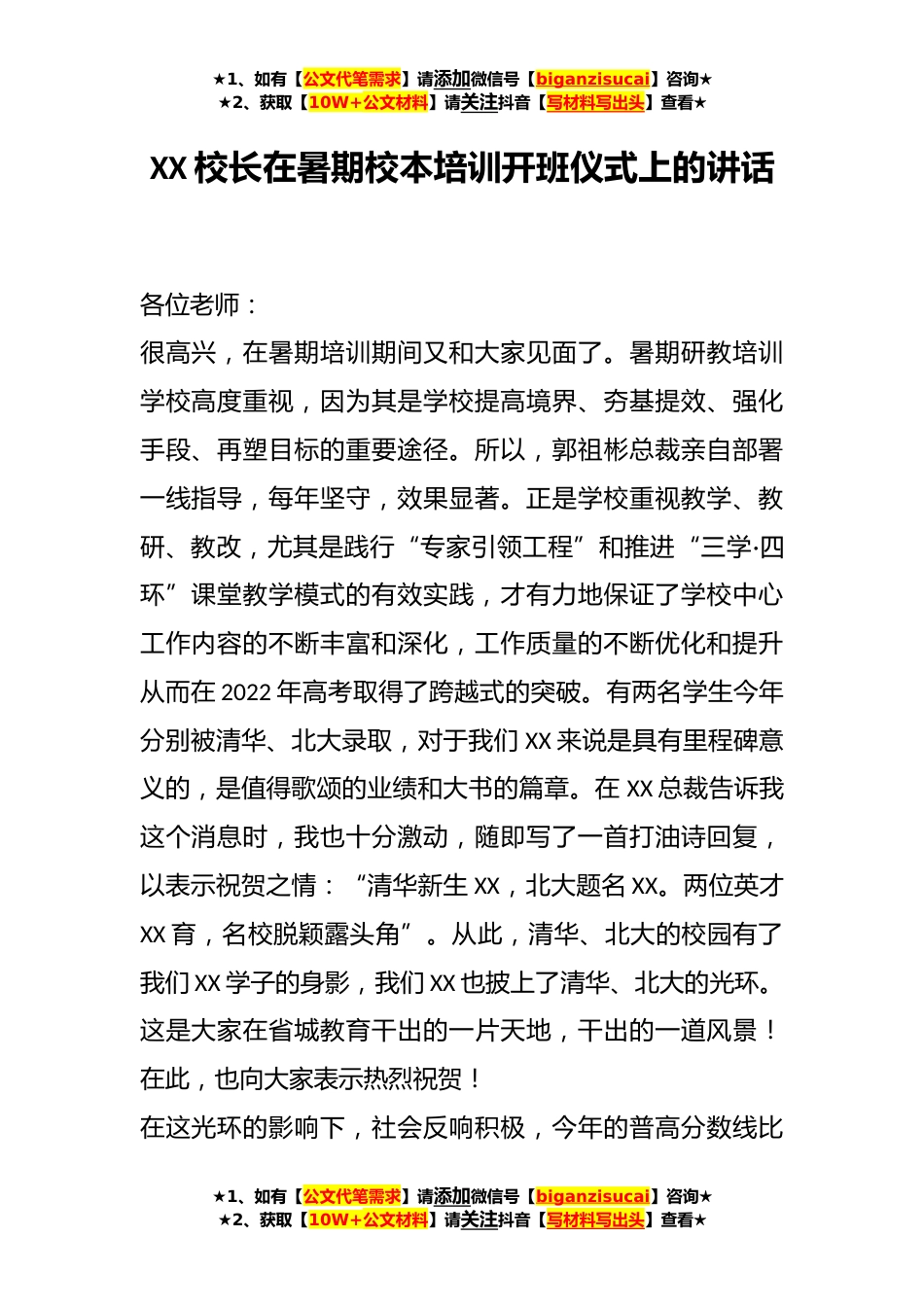 ★1、如有【公文代笔需求】请添加微信号【biganzisucai】咨询★★2、获取【10W+公文材料】请关注抖音【写材料写出头】查看★XX校长在暑期校本培训开班仪式上的讲话各位老师:很高兴,在暑期培训期间又和大家见面了。暑期研教培训学校高度重视,因为其是学校提高境界、夯基提效、强化手段、再塑目标的重要途径。所以,郭祖彬总裁亲自部署一线指导,每年坚守,效果显著。正是学校重视教学、教研、教改,尤其是践行“专家引领工程”和推进“三学·四环”课堂教学模式的有效实践,才有力地保证了学校中心工作内容的不断丰富和深化,工作质量的不断优化和提升从而在2022年高考取得了跨越式的突破。有两名学生今年分别被清华、北大录取,对于我们XX来说是具有里程碑意义的,是值得歌颂的业绩和大书的篇章。在XX总裁告诉...