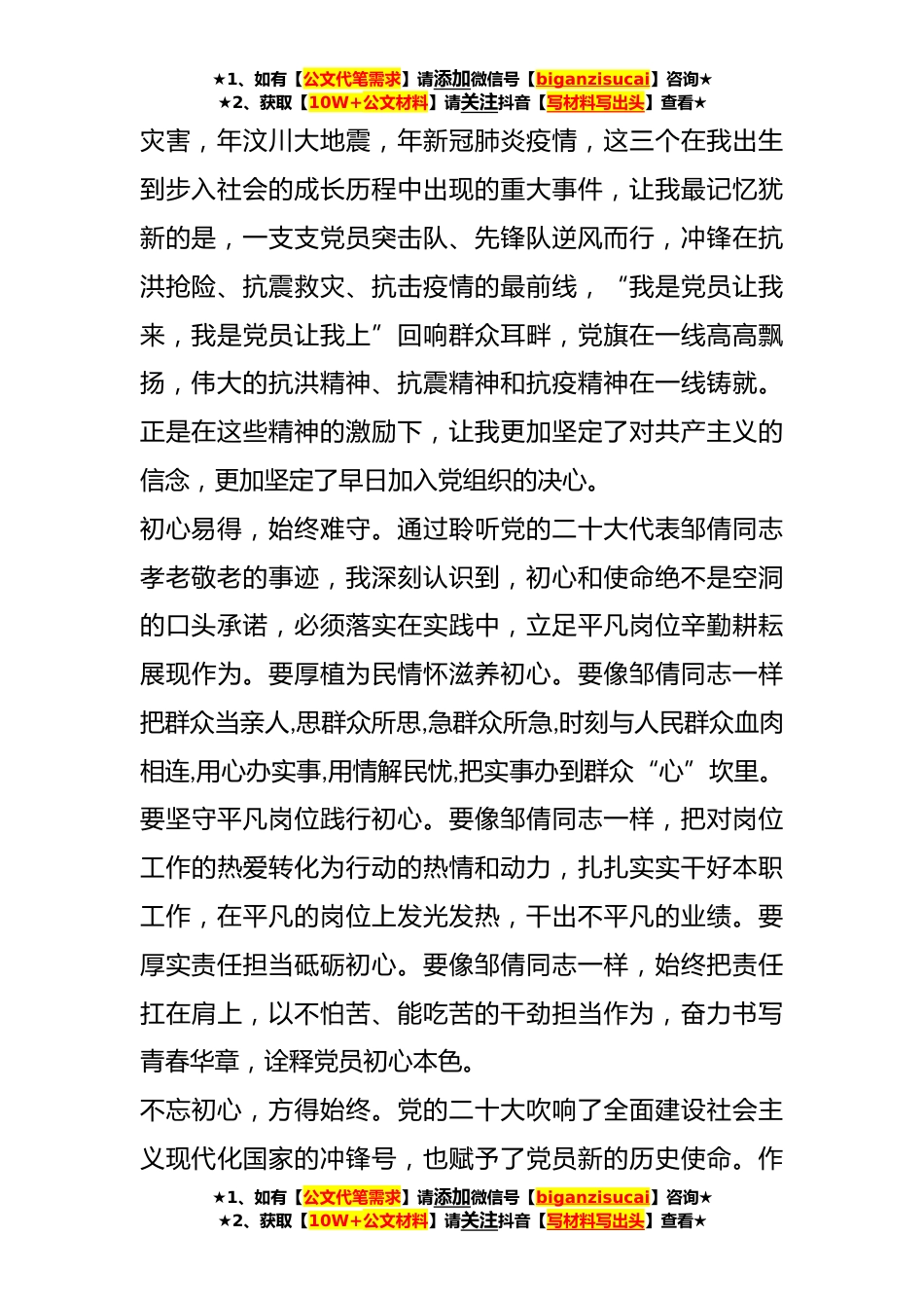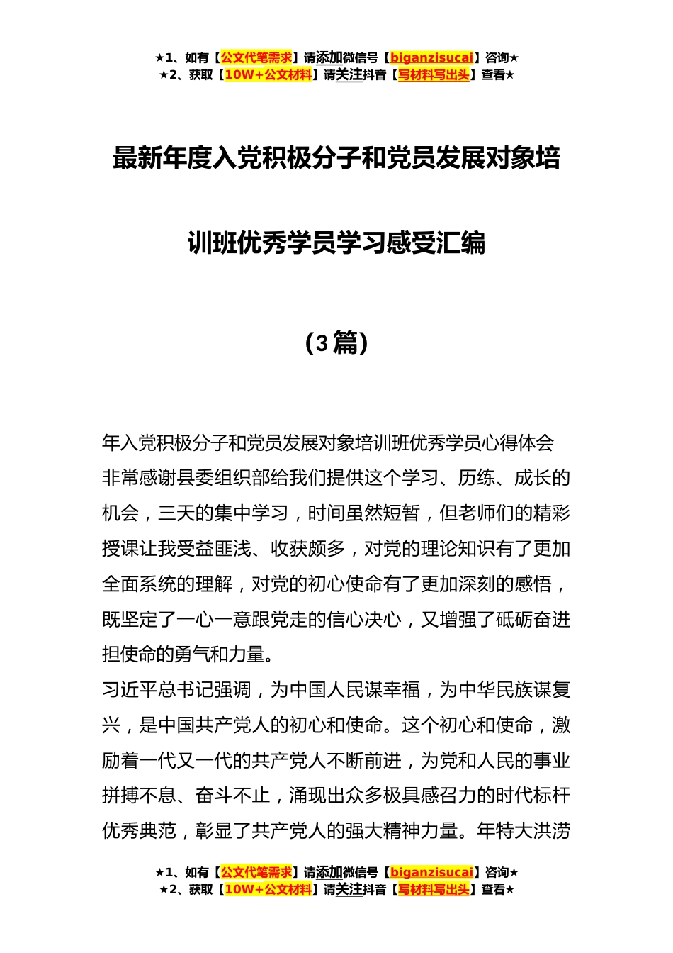 ★1、如有【公文代笔需求】请添加微信号【biganzisucai】咨询★★2、获取【10W+公文材料】请关注抖音【写材料写出头】查看★最新年度入党积极分子和党员发展对象培训班优秀学员学习感受汇编(3篇)年入党积极分子和党员发展对象培训班优秀学员心得体会非常感谢县委组织部给我们提供这个学习、历练、成长的机会,三天的集中学习,时间虽然短暂,但老师们的精彩授课让我受益匪浅、收获颇多,对党的理论知识有了更加全面系统的理解,对党的初心使命有了更加深刻的感悟,既坚定了一心一意跟党走的信心决心,又增强了砥砺奋进担使命的勇气和力量。习近平总书记强调,为中国人民谋幸福,为中华民族谋复兴,是中国共产党人的初心和使命。这个初心和使命,激励着一代又一代的共产党人不断前进,为党和人民的事业拼搏不息、...
