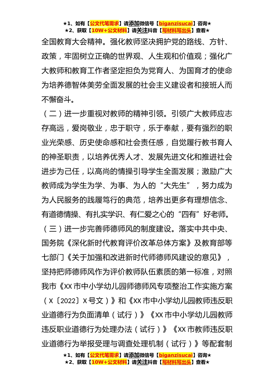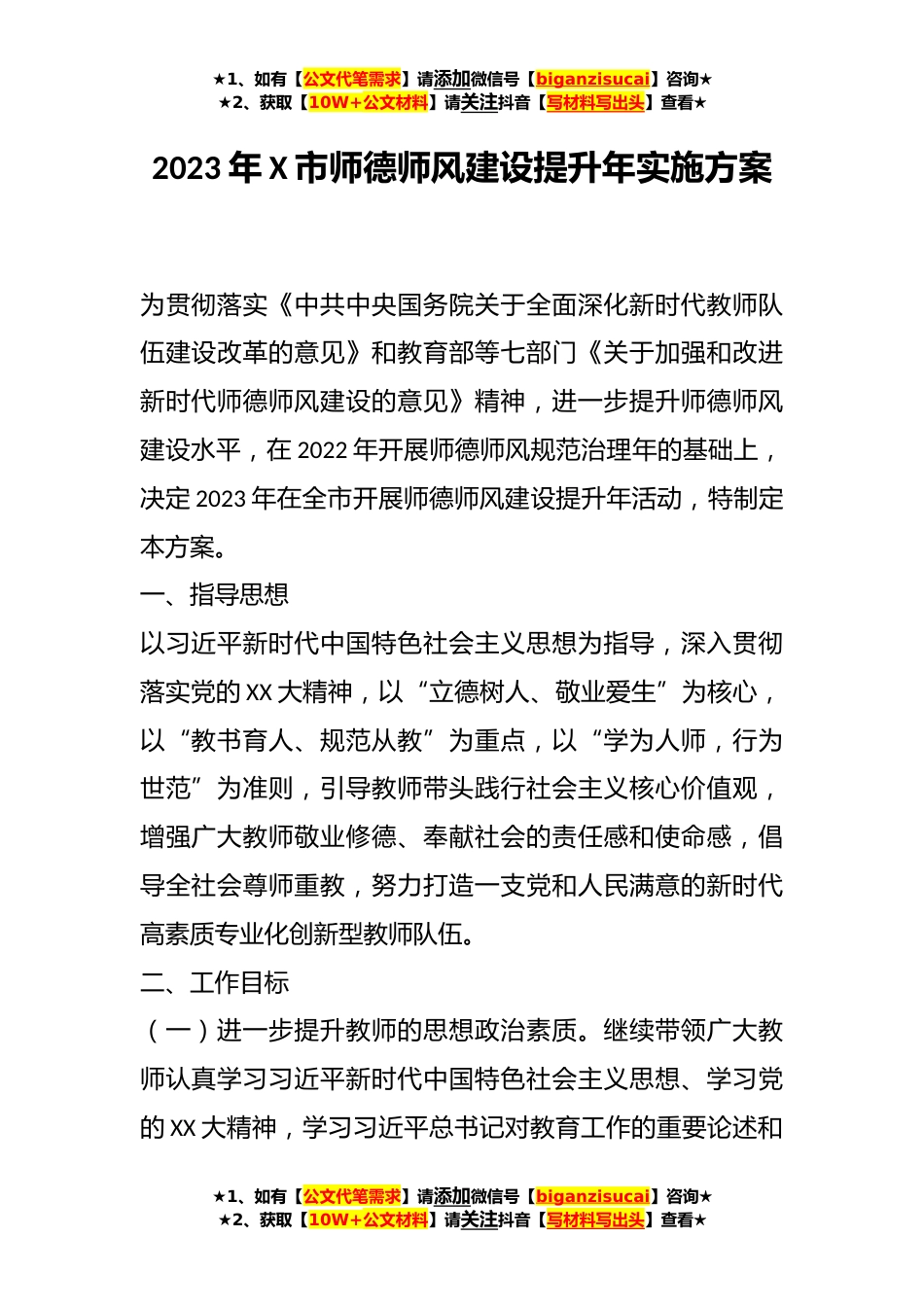 ★1、如有【公文代笔需求】请添加微信号【biganzisucai】咨询★★2、获取【10W+公文材料】请关注抖音【写材料写出头】查看★2023年X市师德师风建设提升年实施方案为贯彻落实《中共中央国务院关于全面深化新时代教师队伍建设改革的意见》和教育部等七部门《关于加强和改进新时代师德师风建设的意见》精神,进一步提升师德师风建设水平,在2022年开展师德师风规范治理年的基础上,决定2023年在全市开展师德师风建设提升年活动,特制定本方案。一、指导思想以习近平新时代中国特色社会主义思想为指导,深入贯彻落实党的XX大精神,以“立德树人、敬业爱生”为核心,以“教书育人、规范从教”为重点,以“学为人师,行为世范”为准则,引导教师带头践行社会主义核心价值观,增强广大教师敬业修德、奉献社会的责任感和使...