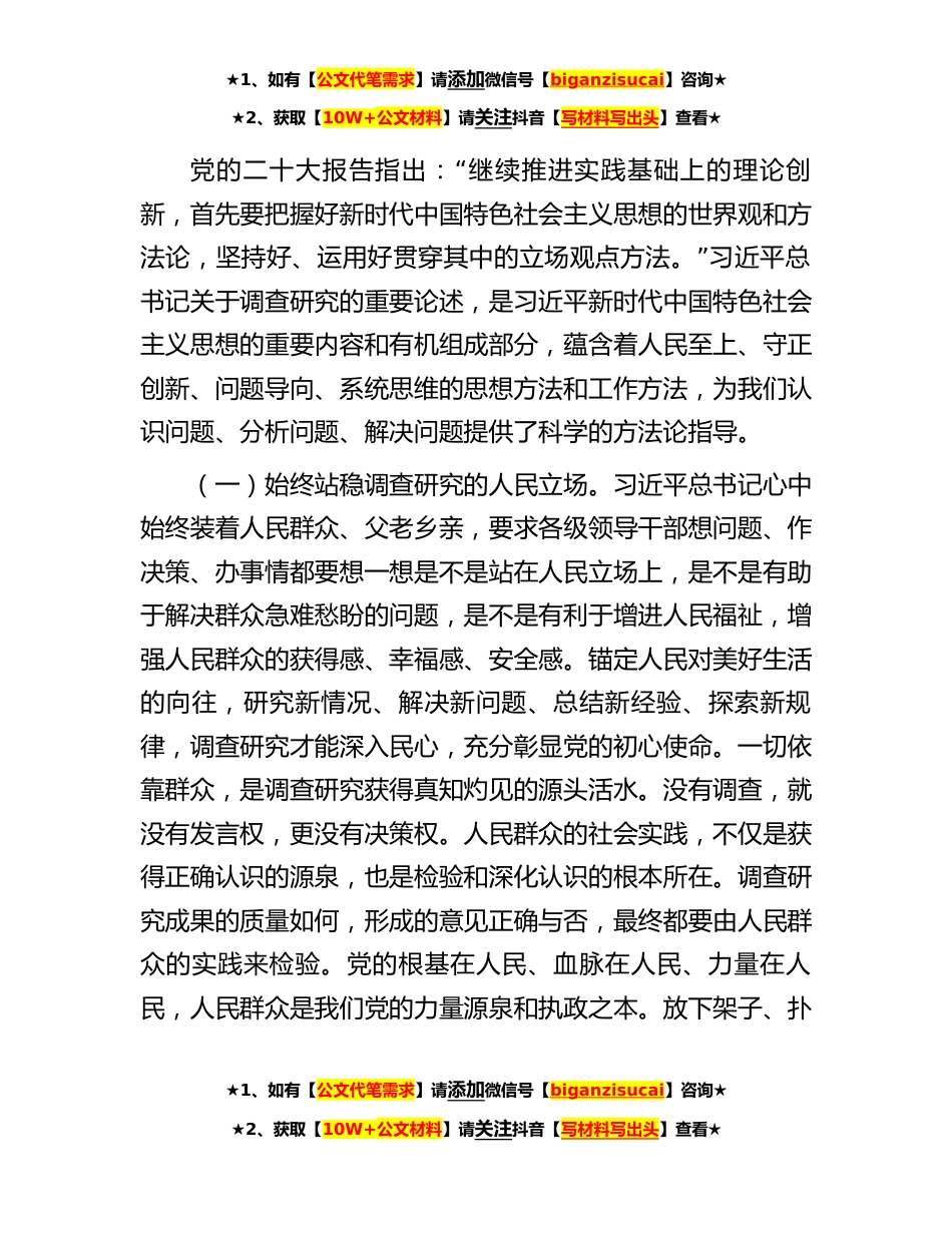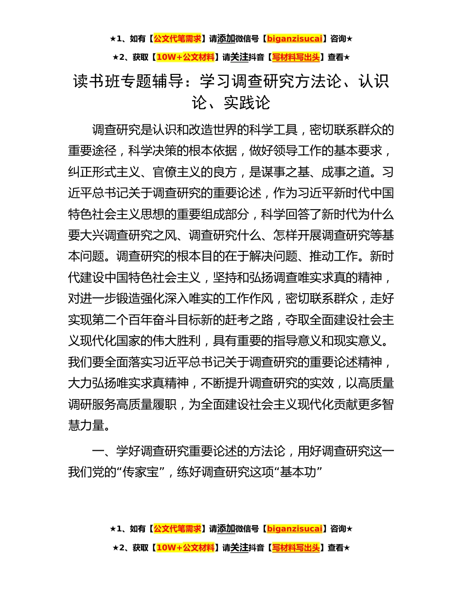 ★1、如有【公文代笔需求】请添加微信号【biganzisucai】咨询★★2、获取【10W+公文材料】请关注抖音【写材料写出头】查看★读书班专题辅导:学习调查研究方法论、认识论、实践论调查研究是认识和改造世界的科学工具,密切联系群众的重要途径,科学决策的根本依据,做好领导工作的基本要求,纠正形式主义、官僚主义的良方,是谋事之基、成事之道。习近平总书记关于调查研究的重要论述,作为习近平新时代中国特色社会主义思想的重要组成部分,科学回答了新时代为什么要大兴调查研究之风、调查研究什么、怎样开展调查研究等基本问题。调查研究的根本目的在于解决问题、推动工作。新时代建设中国特色社会主义,坚持和弘扬调查唯实求真的精神,对进一步锻造强化深入唯实的工作作风,密切联系群众,走好实现第二个百年...