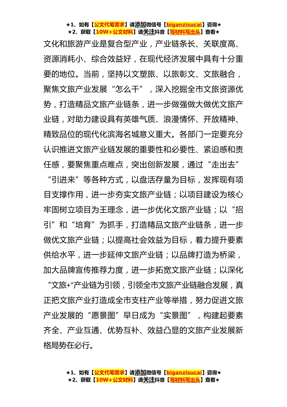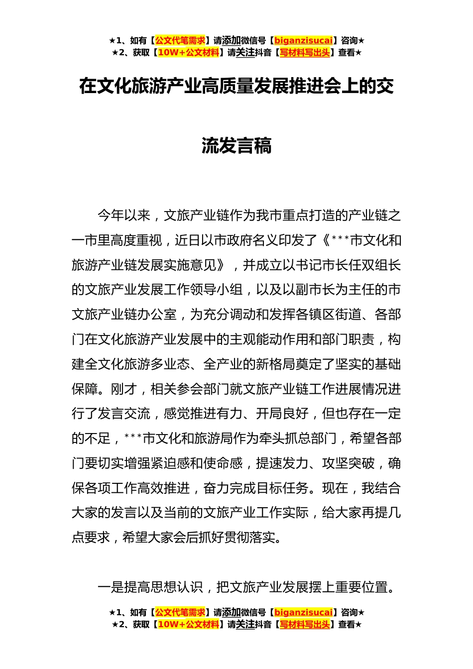 ★1、如有【公文代笔需求】请添加微信号【biganzisucai】咨询★★2、获取【10W+公文材料】请关注抖音【写材料写出头】查看★在文化旅游产业高质量发展推进会上的交流发言稿今年以来,文旅产业链作为我市重点打造的产业链之一市里高度重视,近日以市政府名义印发了《***市文化和旅游产业链发展实施意见》,并成立以书记市长任双组长的文旅产业发展工作领导小组,以及以副市长为主任的市文旅产业链办公室,为充分调动和发挥各镇区街道、各部门在文化旅游产业发展中的主观能动作用和部门职责,构建全文化旅游多业态、全产业的新格局奠定了坚实的基础保障。刚才,相关参会部门就文旅产业链工作进展情况进行了发言交流,感觉推进有力、开局良好,但也存在一定的不足,***市文化和旅游局作为牵头抓总部门,希望各部门要...