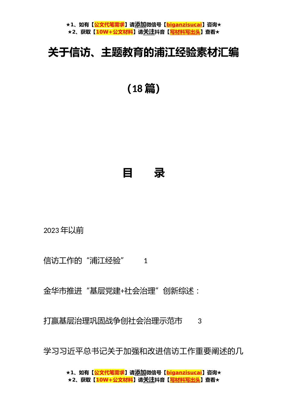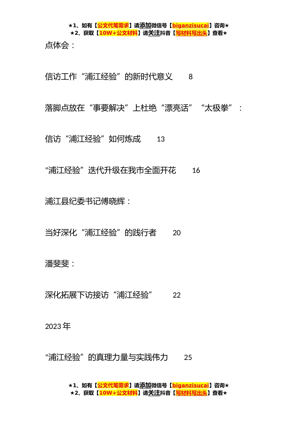 ★1、如有【公文代笔需求】请添加微信号【biganzisucai】咨询★★2、获取【10W+公文材料】请关注抖音【写材料写出头】查看★关于信访、主题教育的浦江经验素材汇编(18篇)目录2023年以前信访工作的“浦江经验”1金华市推进“基层党建+社会治理”创新综述:打赢基层治理巩固战争创社会治理示范市3学习习近平总书记关于加强和改进信访工作重要阐述的几★1、如有【公文代笔需求】请添加微信号【biganzisucai】咨询★★2、获取【10W+公文材料】请关注抖音【写材料写出头】查看★★1、如有【公文代笔需求】请添加微信号【biganzisucai】咨询★★2、获取【10W+公文材料】请关注抖音【写材料写出头】查看★点体会:信访工作“浦江经验”的新时代意义8落脚点放在“事要解决”上杜绝“漂亮话”“太极拳”:信访“浦江经验...