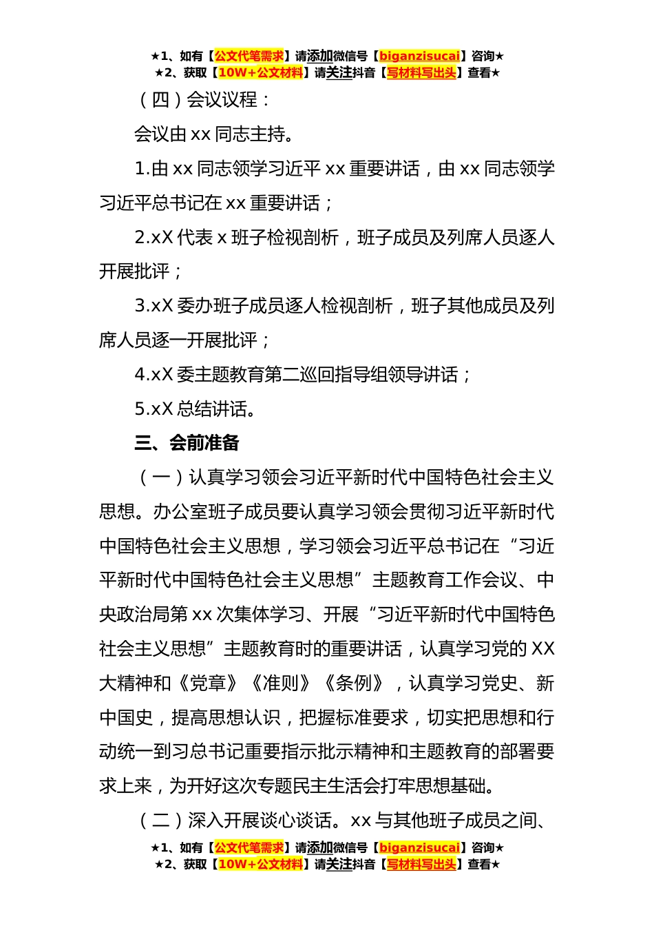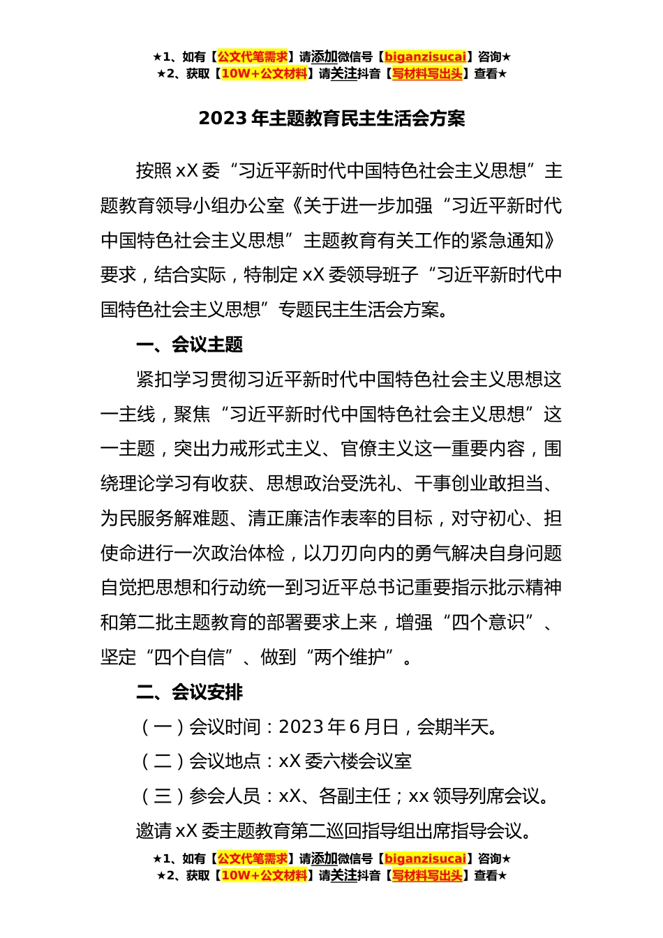 ★1、如有【公文代笔需求】请添加微信号【biganzisucai】咨询★★2、获取【10W+公文材料】请关注抖音【写材料写出头】查看★2023年主题教育民主生活会方案按照xX委“习近平新时代中国特色社会主义思想”主题教育领导小组办公室《关于进一步加强“习近平新时代中国特色社会主义思想”主题教育有关工作的紧急通知》要求,结合实际,特制定xX委领导班子“习近平新时代中国特色社会主义思想”专题民主生活会方案。一、会议主题紧扣学习贯彻习近平新时代中国特色社会主义思想这一主线,聚焦“习近平新时代中国特色社会主义思想”这一主题,突出力戒形式主义、官僚主义这一重要内容,围绕理论学习有收获、思想政治受洗礼、干事创业敢担当、为民服务解难题、清正廉洁作表率的目标,对守初心、担使命进行一次政治体检,以...