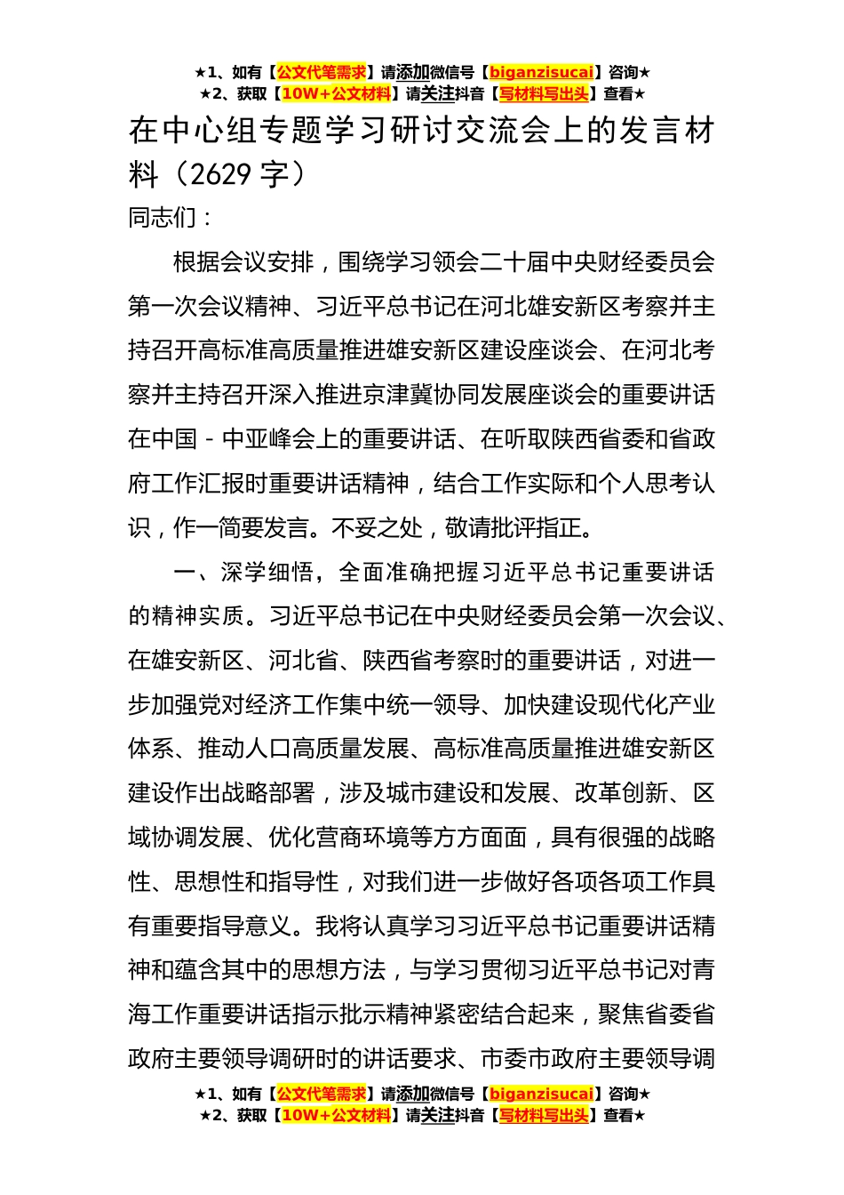 ★1、如有【公文代笔需求】请添加微信号【biganzisucai】咨询★★2、获取【10W+公文材料】请关注抖音【写材料写出头】查看★在中心组专题学习研讨交流会上的发言材料(2629字)同志们:根据会议安排,围绕学习领会二十届中央财经委员会第一次会议精神、习近平总书记在河北雄安新区考察并主持召开高标准高质量推进雄安新区建设座谈会、在河北考察并主持召开深入推进京津冀协同发展座谈会的重要讲话在中国-中亚峰会上的重要讲话、在听取陕西省委和省政府工作汇报时重要讲话精神,结合工作实际和个人思考认识,作一简要发言。不妥之处,敬请批评指正。一、深学细悟,全面准确把握习近平总书记重要讲话的精神实质。习近平总书记在中央财经委员会第一次会议、在雄安新区、河北省、陕西省考察时的重要讲话,对进一步加...