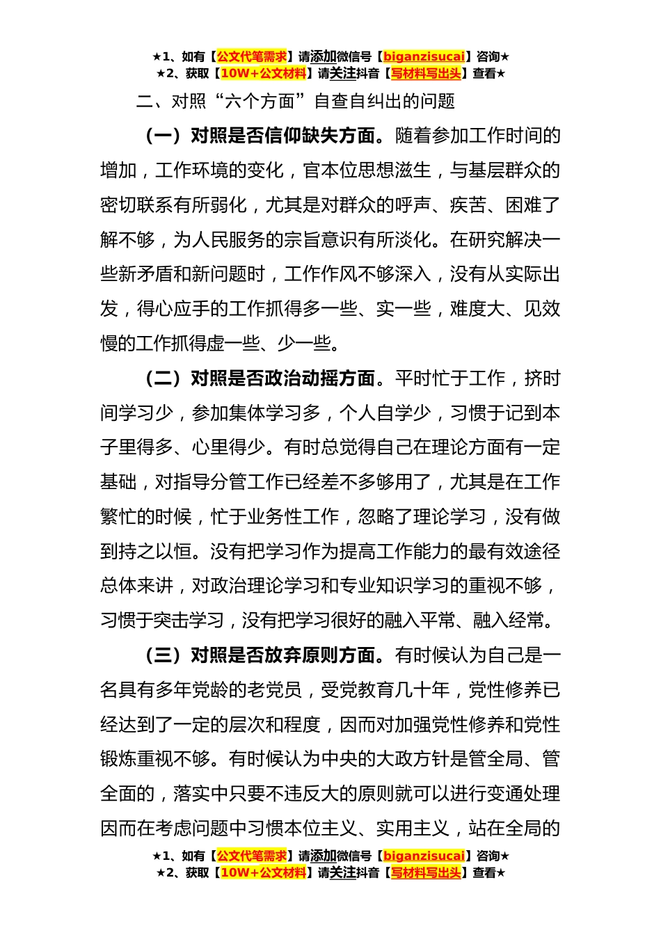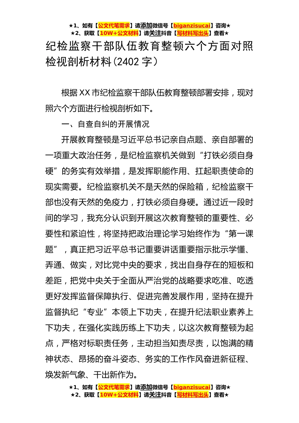 ★1、如有【公文代笔需求】请添加微信号【biganzisucai】咨询★★2、获取【10W+公文材料】请关注抖音【写材料写出头】查看★纪检监察干部队伍教育整顿六个方面对照检视剖析材料(2402字)根据XX市纪检监察干部队伍教育整顿部署安排,现对照六个方面进行检视剖析如下。一、自查自纠的开展情况开展教育整顿是习近平总书记亲自点题、亲自部署的一项重大政治任务,是纪检监察机关做到“打铁必须自身硬”的务实有效举措,是发挥职能作用、扛起职责使命的现实需要。纪检监察机关不是天然的保险箱,纪检监察干部也没有天然的免疫力,打铁必须自身硬。通过近一段时间的学习,我充分认识到开展这次教育整顿的重要性、必要性和紧迫性,将坚持把政治理论学习始终作为“第一课题”,真正把习近平总书记重要讲话重要指示批示学懂...