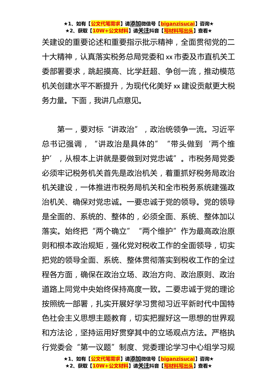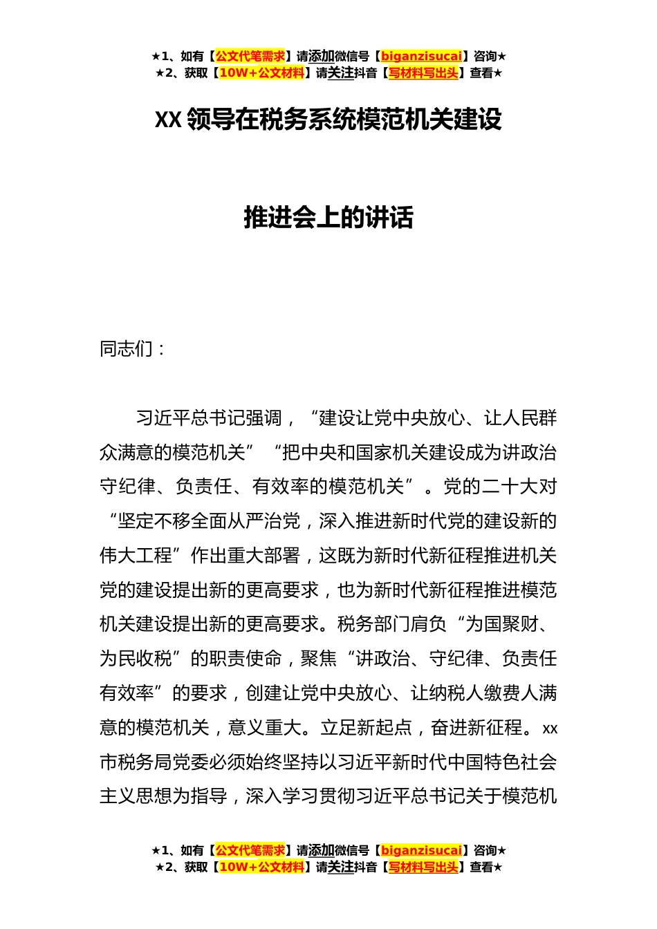 ★1、如有【公文代笔需求】请添加微信号【biganzisucai】咨询★★2、获取【10W+公文材料】请关注抖音【写材料写出头】查看★XX领导在税务系统模范机关建设推进会上的讲话同志们:习近平总书记强调,“建设让党中央放心、让人民群众满意的模范机关”“把中央和国家机关建设成为讲政治守纪律、负责任、有效率的模范机关”。党的二十大对“坚定不移全面从严治党,深入推进新时代党的建设新的伟大工程”作出重大部署,这既为新时代新征程推进机关党的建设提出新的更高要求,也为新时代新征程推进模范机关建设提出新的更高要求。税务部门肩负“为国聚财、为民收税”的职责使命,聚焦“讲政治、守纪律、负责任有效率”的要求,创建让党中央放心、让纳税人缴费人满意的模范机关,意义重大。立足新起点,奋进新征程。xx市...