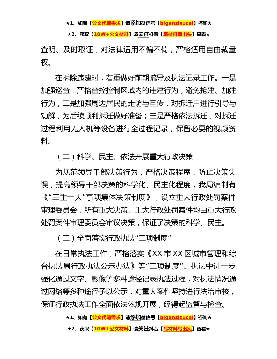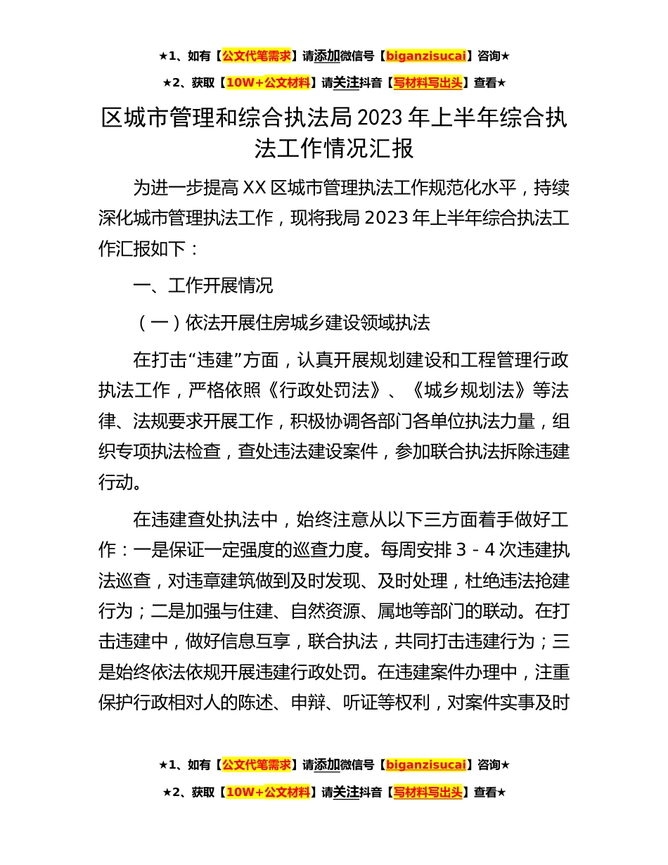 ★1、如有【公文代笔需求】请添加微信号【biganzisucai】咨询★★2、获取【10W+公文材料】请关注抖音【写材料写出头】查看★区城市管理和综合执法局2023年上半年综合执法工作情况汇报为进一步提高XX区城市管理执法工作规范化水平,持续深化城市管理执法工作,现将我局2023年上半年综合执法工作汇报如下:一、工作开展情况(一)依法开展住房城乡建设领域执法“”在打击违建方面,认真开展规划建设和工程管理行政执法工作,严格依照《行政处罚法》、《城乡规划法》等法律、法规要求开展工作,积极协调各部门各单位执法力量,组织专项执法检查,查处违法建设案件,参加联合执法拆除违建行动。在违建查处执法中,始终注意从以下三方面着手做好工作:一是保证一定强度的巡查力度。每周安排3-4次违建执法巡查,对违章...
