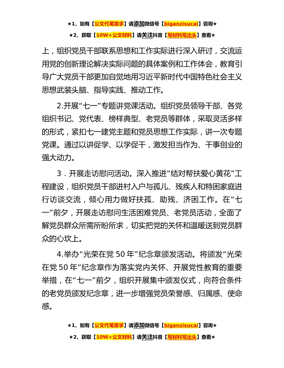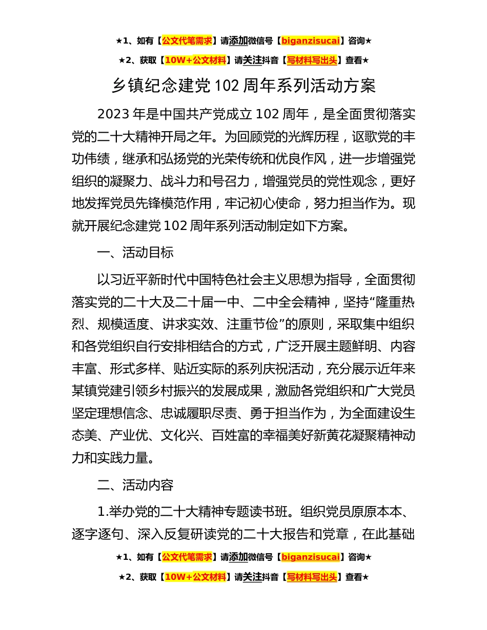 ★1、如有【公文代笔需求】请添加微信号【biganzisucai】咨询★★2、获取【10W+公文材料】请关注抖音【写材料写出头】查看★乡镇纪念建党102周年系列活动方案2023年是中国共产党成立102周年,是全面贯彻落实党的二十大精神开局之年。为回顾党的光辉历程,讴歌党的丰功伟绩,继承和弘扬党的光荣传统和优良作风,进一步增强党组织的凝聚力、战斗力和号召力,增强党员的党性观念,更好地发挥党员先锋模范作用,牢记初心使命,努力担当作为。现就开展纪念建党102周年系列活动制定如下方案。一、活动目标以习近平新时代中国特色社会主义思想为指导,全面贯彻“落实党的二十大及二十届一中、二中全会精神,坚持隆重热”烈、规模适度、讲求实效、注重节俭的原则,采取集中组织和各党组织自行安排相结合的方式,广泛开展主...