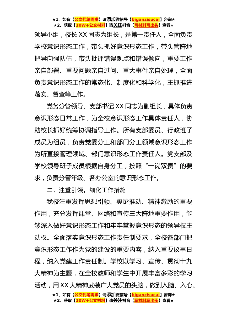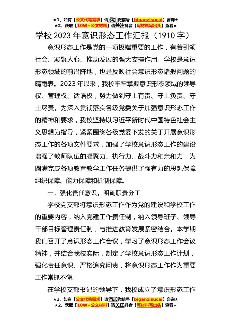 ★1、如有【公文代笔需求】请添加微信号【biganzisucai】咨询★★2、获取【10W+公文材料】请关注抖音【写材料写出头】查看★学校2023年意识形态工作汇报(1910字)意识形态工作是党的一项极端重要的工作,有着引领社会、凝聚人心、推动发展的强大支撑作用。学校是意识形态领域的前沿阵地,也是反映社会意识形态诸般问题的晴雨表。2023年以来,我校牢牢掌握意识形态领域的领导权、管理权、话语权,努力做到守土有责、守土负责、守土尽责。为深入贯彻落实各级党委关于加强意识形态工作的精神和要求,我校坚持以习近平新时代中国特色社会主义思想为指导,紧紧围绕各级党委下发的关于开展意识形态工作的各项文件要求,加强了学校意识形态工作的建设增强了教师队伍的凝聚力、执行力、战斗力和亲和力,为圆满完成各项教...