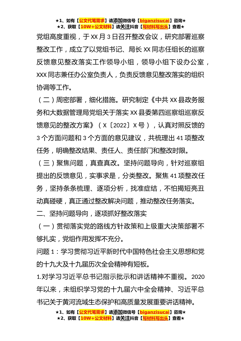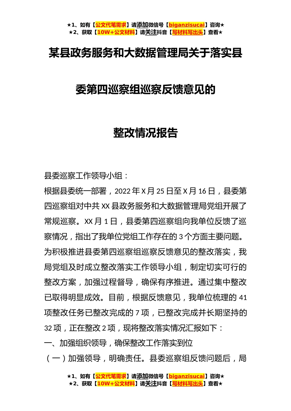 ★1、如有【公文代笔需求】请添加微信号【biganzisucai】咨询★★2、获取【10W+公文材料】请关注抖音【写材料写出头】查看★某县政务服务和大数据管理局关于落实县委第四巡察组巡察反馈意见的整改情况报告县委巡察工作领导小组:根据县委统一部署,2022年X月25日至X月16日,县委第四巡察组对中共XX县政务服务和大数据管理局党组开展了常规巡察。XX月1日,县委第四巡察组向我单位反馈了巡察情况,指出了我单位党组工作存在的3个方面主要问题。为积极推进县委第四巡察组巡察反馈意见的整改落实,我局党组及时成立整改落实工作领导小组,制定切实可行的整改方案,加强过程督导,确保有序推进。通过集中整改已取得明显成效。目前,根据反馈意见,我单位梳理的41项整改任务已整改完成的7项,已整改完成并长期坚持的32项...