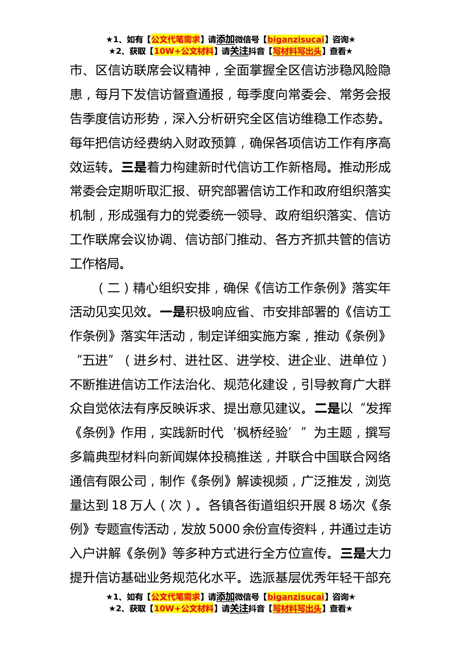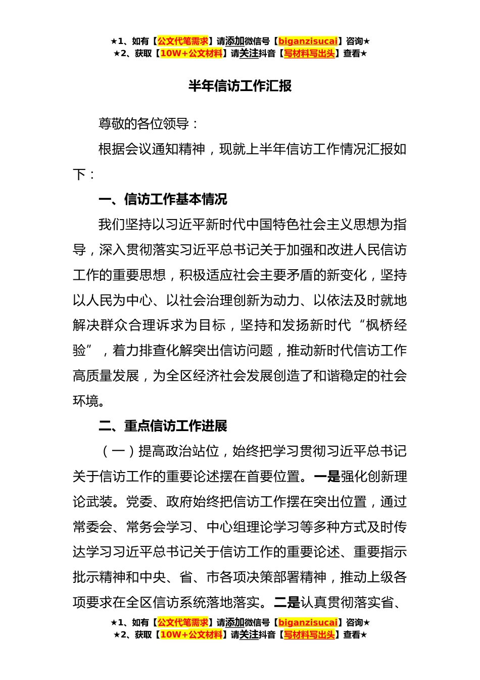 ★1、如有【公文代笔需求】请添加微信号【biganzisucai】咨询★★2、获取【10W+公文材料】请关注抖音【写材料写出头】查看★半年信访工作汇报尊敬的各位领导:根据会议通知精神,现就上半年信访工作情况汇报如下:一、信访工作基本情况我们坚持以习近平新时代中国特色社会主义思想为指导,深入贯彻落实习近平总书记关于加强和改进人民信访工作的重要思想,积极适应社会主要矛盾的新变化,坚持以人民为中心、以社会治理创新为动力、以依法及时就地解决群众合理诉求为目标,坚持和发扬新时代“枫桥经验”,着力排查化解突出信访问题,推动新时代信访工作高质量发展,为全区经济社会发展创造了和谐稳定的社会环境。二、重点信访工作进展(一)提高政治站位,始终把学习贯彻习近平总书记关于信访工作的重要论述摆在首...