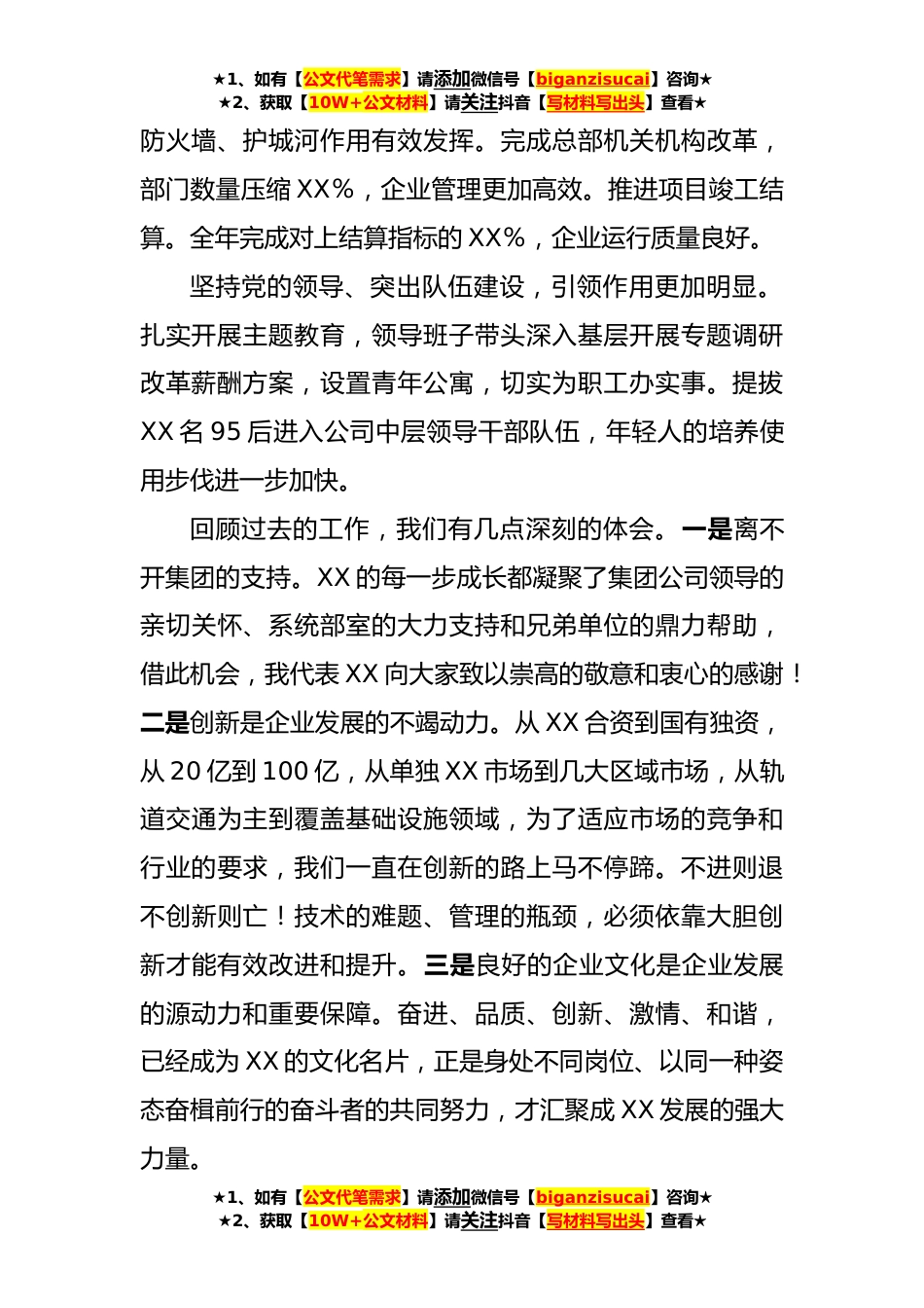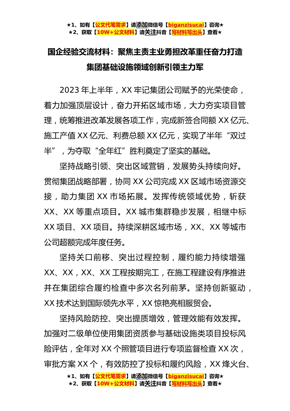 ★1、如有【公文代笔需求】请添加微信号【biganzisucai】咨询★★2、获取【10W+公文材料】请关注抖音【写材料写出头】查看★国企经验交流材料:聚焦主责主业勇担改革重任奋力打造集团基础设施领域创新引领主力军2023年上半年,XX牢记集团公司赋予的光荣使命,着力加强顶层设计,奋力开拓区域市场,大力夯实项目管理,统筹推进改革发展各项工作,完成新签合同额XX亿元、施工产值XX亿元、利费总额XX亿元,实现了半年“双过半”,为夺取“全年红”胜利奠定了坚实的基础。坚持战略引领、突出区域营销,发展势头持续向好。贯彻集团战略部署,协同XX公司完成XX区域市场资源交接,助力集团XX市场拓展。发挥传统领域优势,斩获XX、XX等重点项目。XX城市集群稳步发展,相继中标XX项目、XX项目。持续深耕区域市场,XX、XX等...