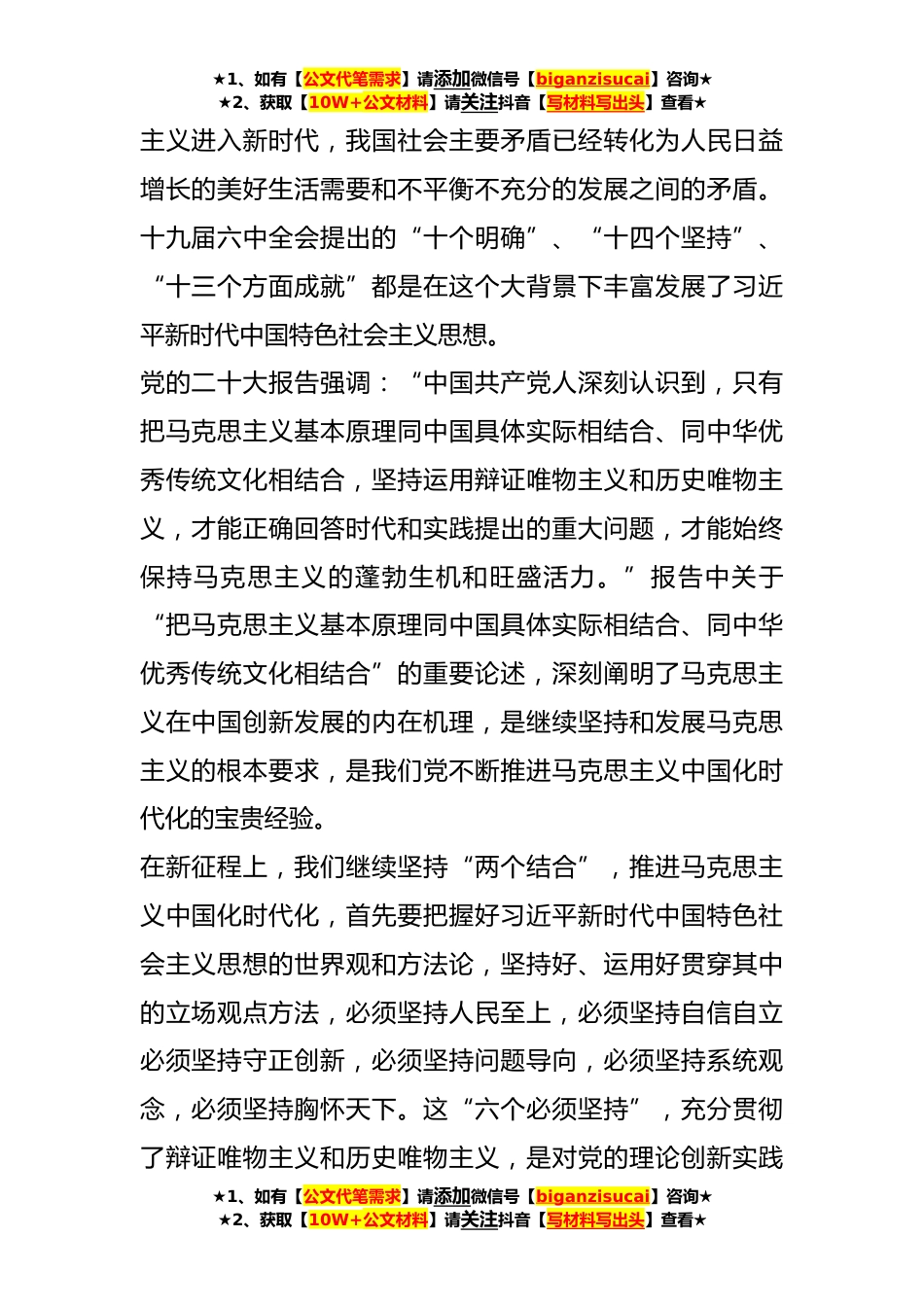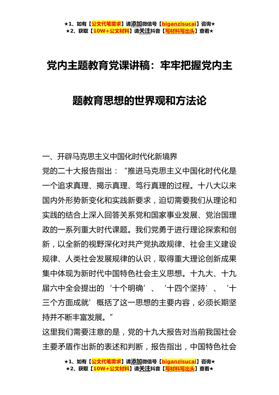 ★1、如有【公文代笔需求】请添加微信号【biganzisucai】咨询★★2、获取【10W+公文材料】请关注抖音【写材料写出头】查看★党内主题教育党课讲稿:牢牢把握党内主题教育思想的世界观和方法论一、开辟马克思主义中国化时代化新境界党的二十大报告指出:“推进马克思主义中国化时代化是一个追求真理、揭示真理、笃行真理的过程。十八大以来国内外形势新变化和实践新要求,迫切需要我们从理论和实践的结合上深入回答关系党和国家事业发展、党治国理政的一系列重大时代课题。我们党勇于进行理论探索和创新,以全新的视野深化对共产党执政规律、社会主义建设规律、人类社会发展规律的认识,取得重大理论创新成果集中体现为新时代中国特色社会主义思想。十九大、十九届六中全会提出的‘十个明确’、‘十四个坚持’、‘...