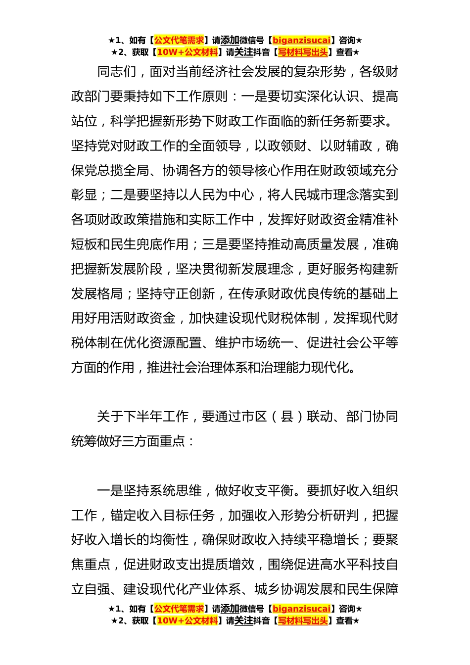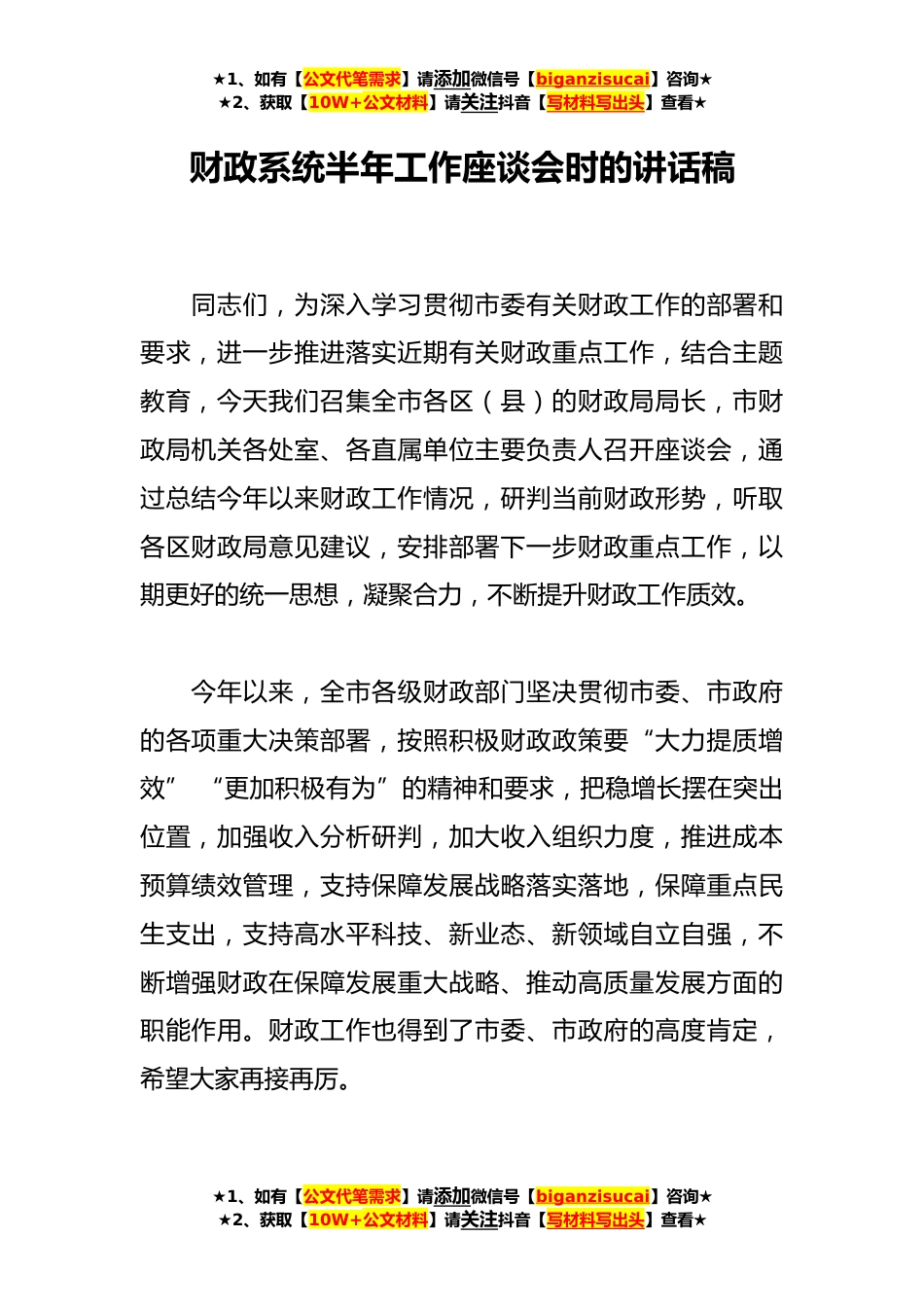★1、如有【公文代笔需求】请添加微信号【biganzisucai】咨询★★2、获取【10W+公文材料】请关注抖音【写材料写出头】查看★财政系统半年工作座谈会时的讲话稿同志们,为深入学习贯彻市委有关财政工作的部署和要求,进一步推进落实近期有关财政重点工作,结合主题教育,今天我们召集全市各区(县)的财政局局长,市财政局机关各处室、各直属单位主要负责人召开座谈会,通过总结今年以来财政工作情况,研判当前财政形势,听取各区财政局意见建议,安排部署下一步财政重点工作,以期更好的统一思想,凝聚合力,不断提升财政工作质效。今年以来,全市各级财政部门坚决贯彻市委、市政府的各项重大决策部署,按照积极财政政策要“大力提质增效”“更加积极有为”的精神和要求,把稳增长摆在突出位置,加强收入分析研判...