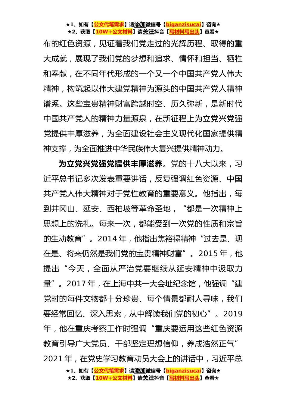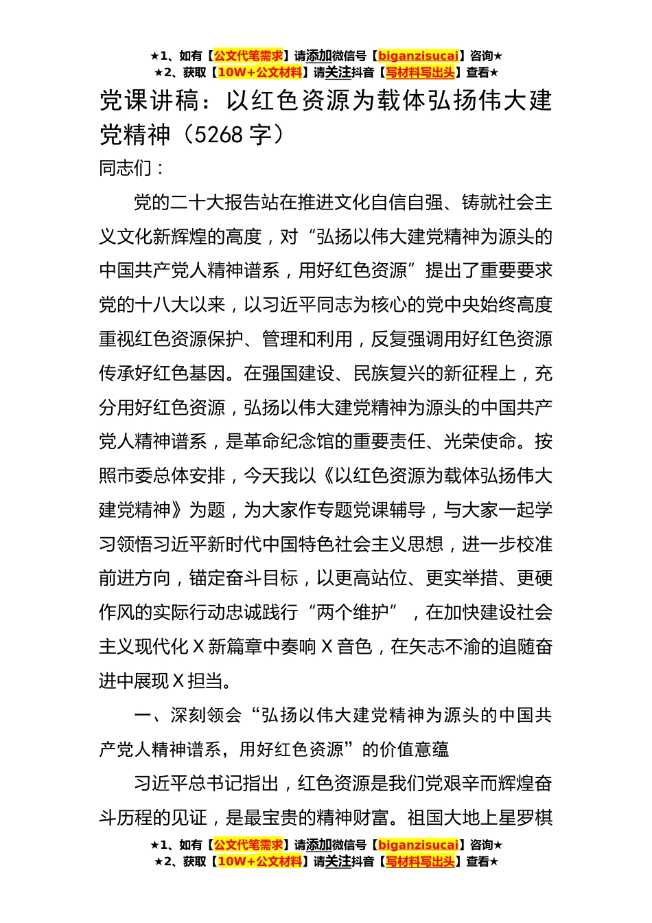 ★1、如有【公文代笔需求】请添加微信号【biganzisucai】咨询★★2、获取【10W+公文材料】请关注抖音【写材料写出头】查看★党课讲稿:以红色资源为载体弘扬伟大建党精神(5268字)同志们:党的二十大报告站在推进文化自信自强、铸就社会主义文化新辉煌的高度,对“弘扬以伟大建党精神为源头的中国共产党人精神谱系,用好红色资源”提出了重要要求党的十八大以来,以习近平同志为核心的党中央始终高度重视红色资源保护、管理和利用,反复强调用好红色资源传承好红色基因。在强国建设、民族复兴的新征程上,充分用好红色资源,弘扬以伟大建党精神为源头的中国共产党人精神谱系,是革命纪念馆的重要责任、光荣使命。按照市委总体安排,今天我以《以红色资源为载体弘扬伟大建党精神》为题,为大家作专题党课辅导,与...