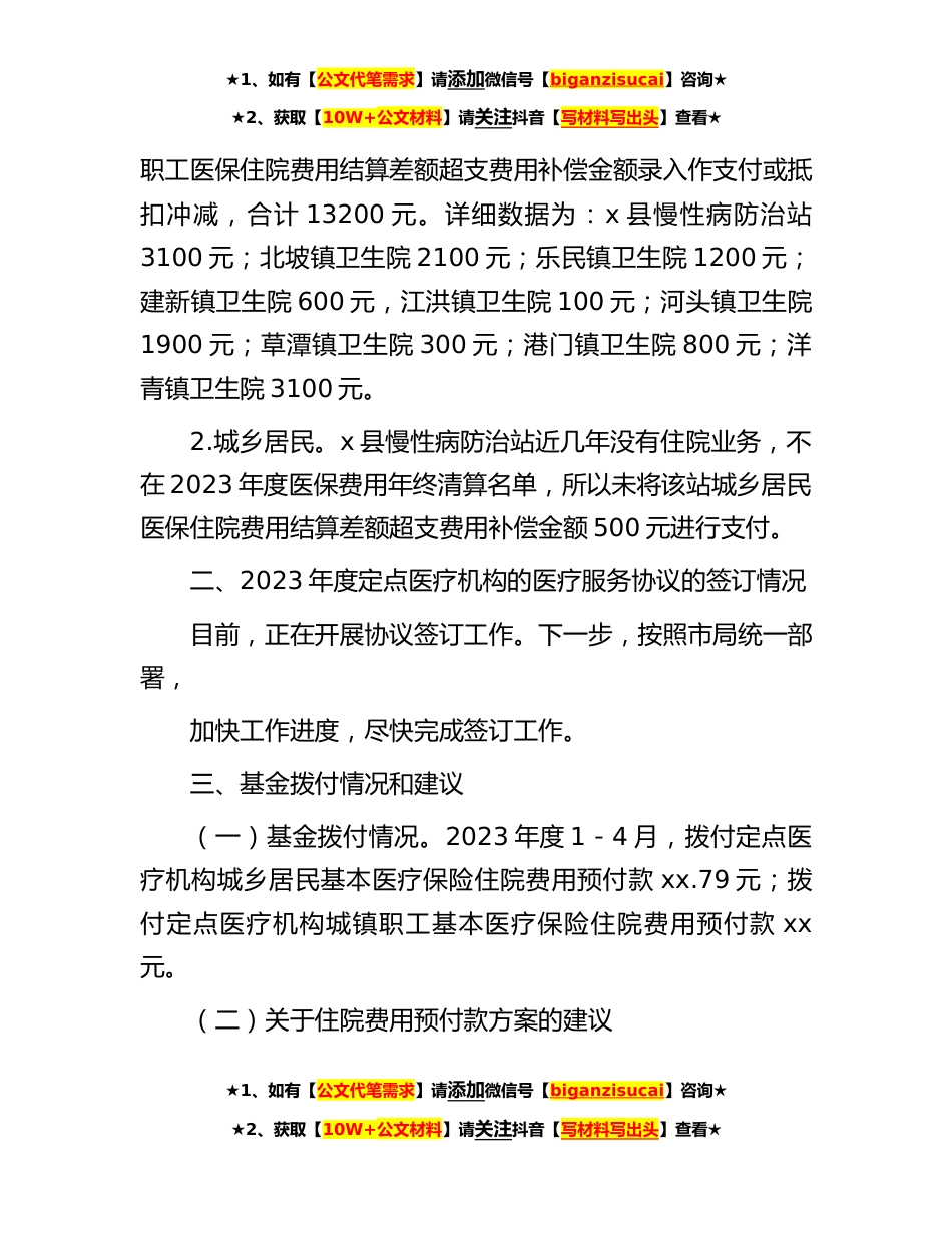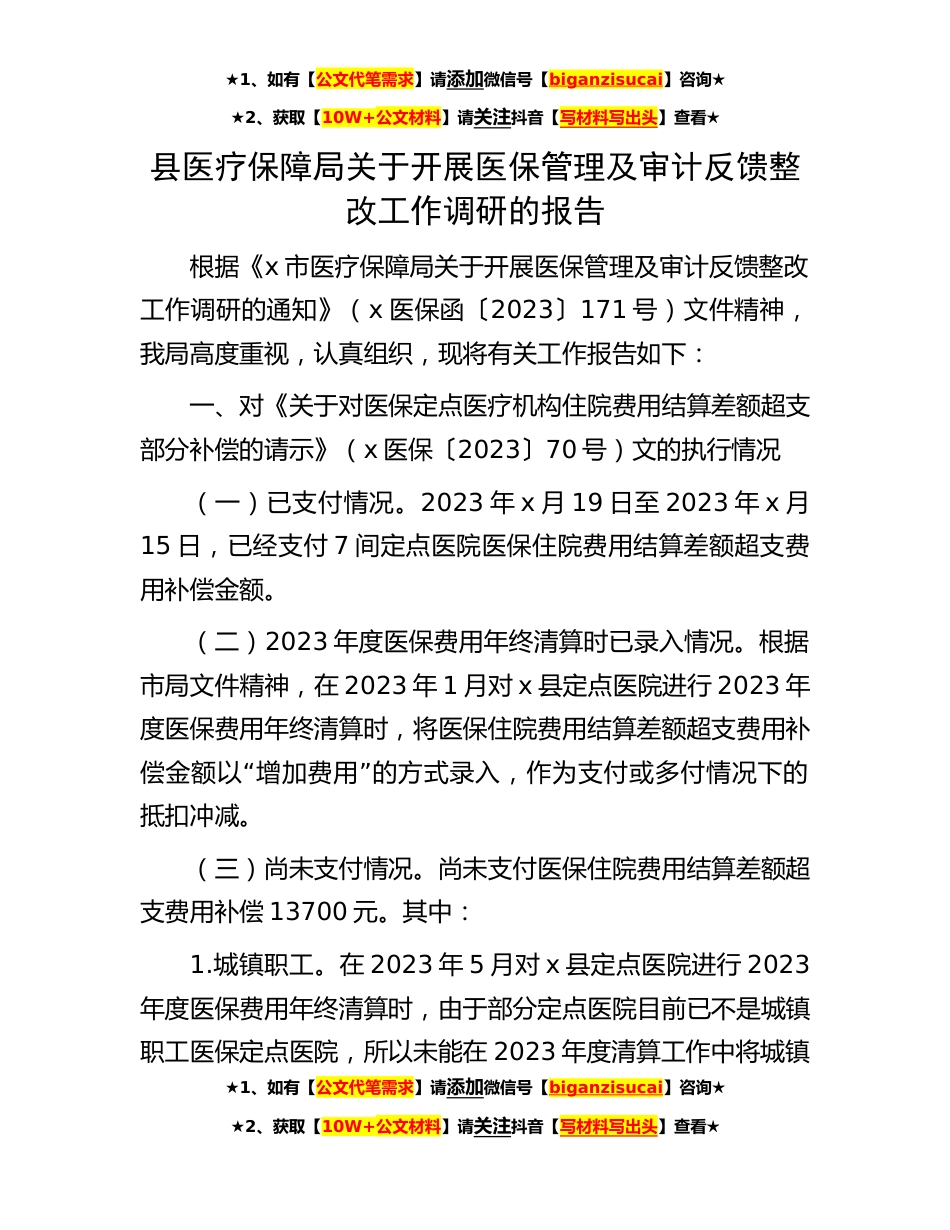 ★1、如有【公文代笔需求】请添加微信号【biganzisucai】咨询★★2、获取【10W+公文材料】请关注抖音【写材料写出头】查看★县医疗保障局关于开展医保管理及审计反馈整改工作调研的报告根据《x市医疗保障局关于开展医保管理及审计反馈整改工作调研的通知》(x医保函〔2023〕171号)文件精神,我局高度重视,认真组织,现将有关工作报告如下:一、对《关于对医保定点医疗机构住院费用结算差额超支部分补偿的请示》(x医保〔2023〕70号)文的执行情况(一)已支付情况。2023年x月19日至2023年x月15日,已经支付7间定点医院医保住院费用结算差额超支费用补偿金额。(二)2023年度医保费用年终清算时已录入情况。根据市局文件精神,在2023年1月对x县定点医院进行2023年度医保费用年终清算时,将医保住院费用结算差额超...