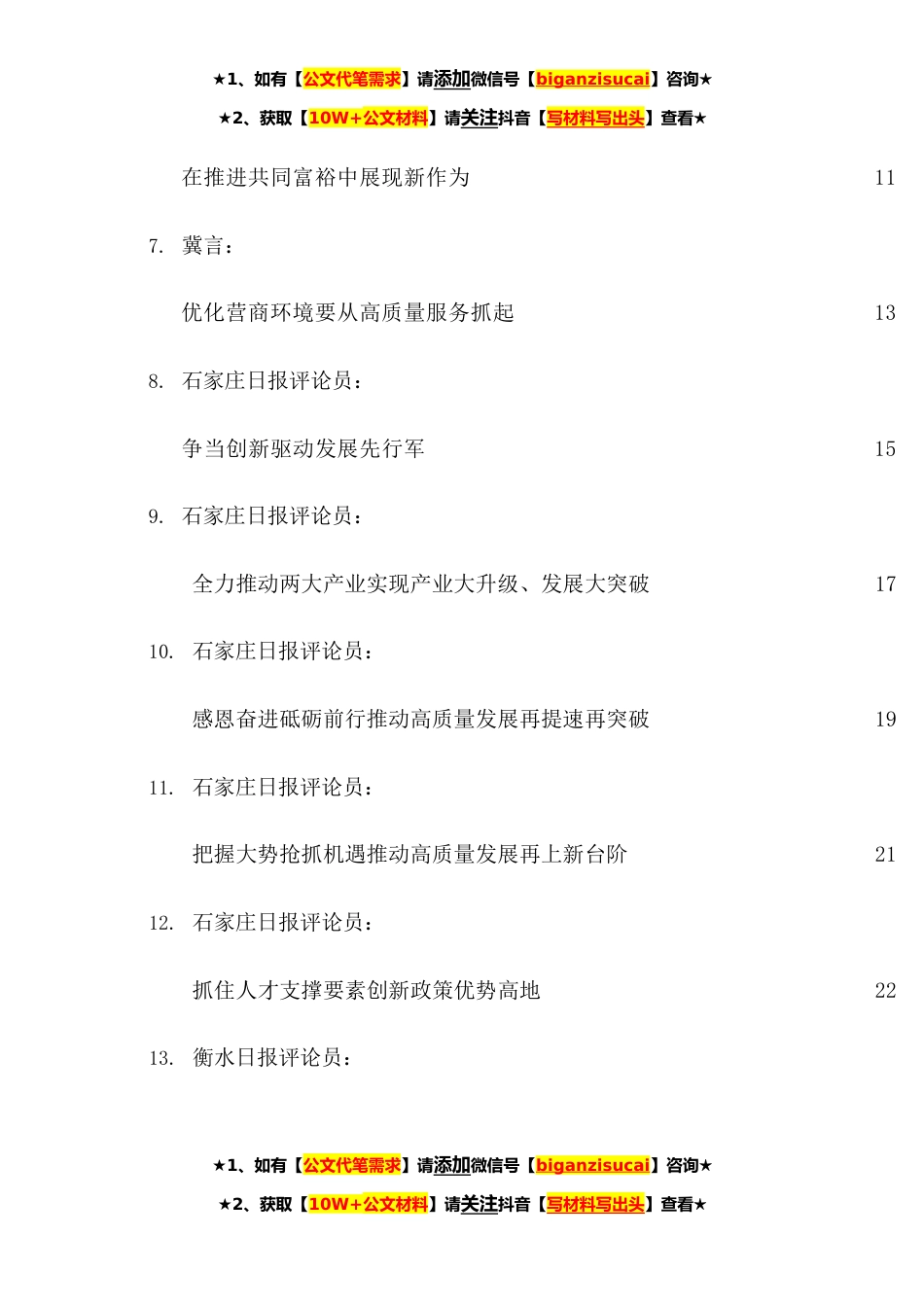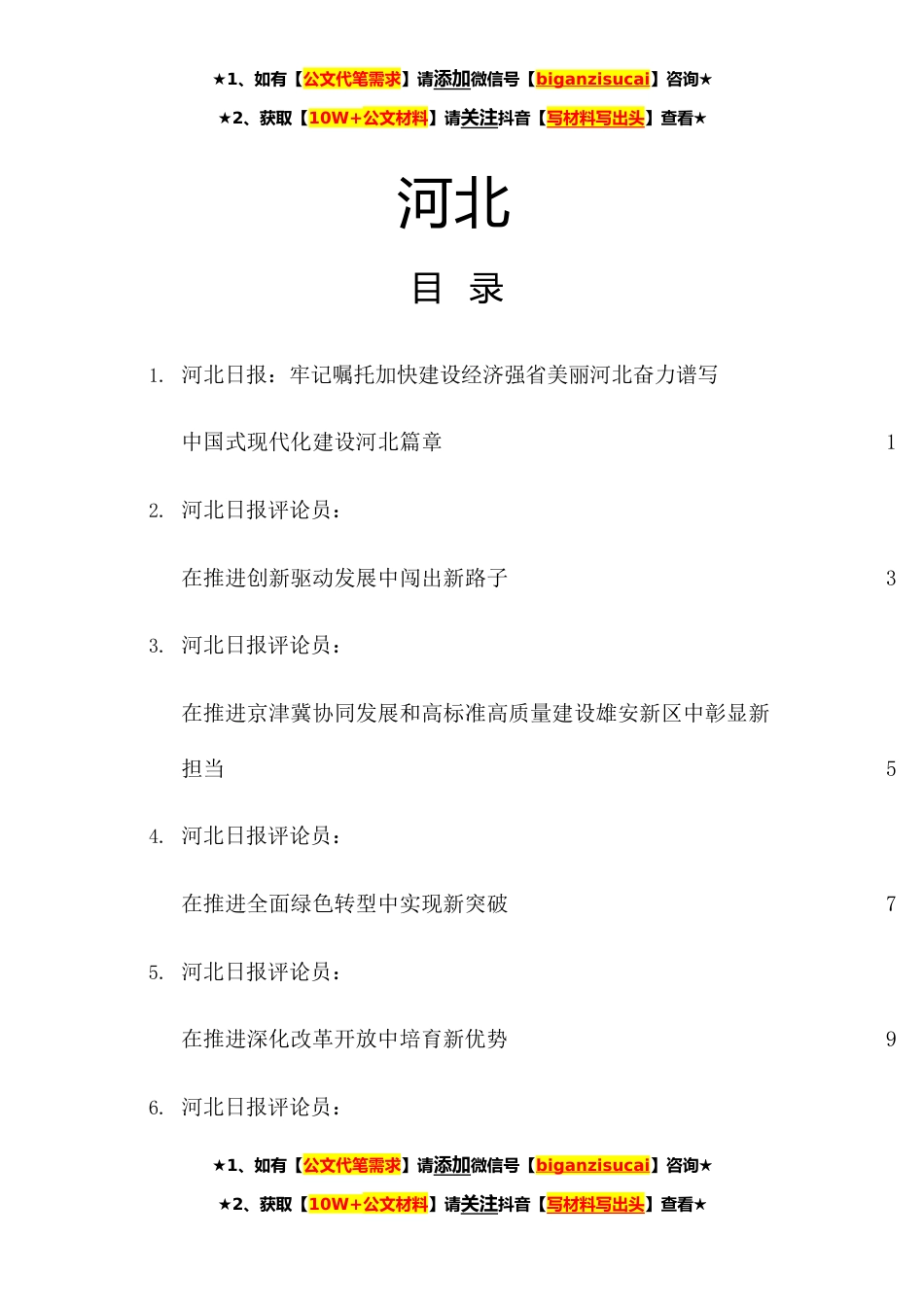 ★1、如有【公文代笔需求】请添加微信号【biganzisucai】咨询★★2、获取【10W+公文材料】请关注抖音【写材料写出头】查看★河北目录1.河北日报:牢记嘱托加快建设经济强省美丽河北奋力谱写中国式现代化建设河北篇章12.河北日报评论员:在推进创新驱动发展中闯出新路子33.河北日报评论员:在推进京津冀协同发展和高标准高质量建设雄安新区中彰显新担当54.河北日报评论员:在推进全面绿色转型中实现新突破75.河北日报评论员:在推进深化改革开放中培育新优势96.河北日报评论员:★1、如有【公文代笔需求】请添加微信号【biganzisucai】咨询★★2、获取【10W+公文材料】请关注抖音【写材料写出头】查看★★1、如有【公文代笔需求】请添加微信号【biganzisucai】咨询★★2、获取【10W+公文材料】请关注抖音【写材料写...