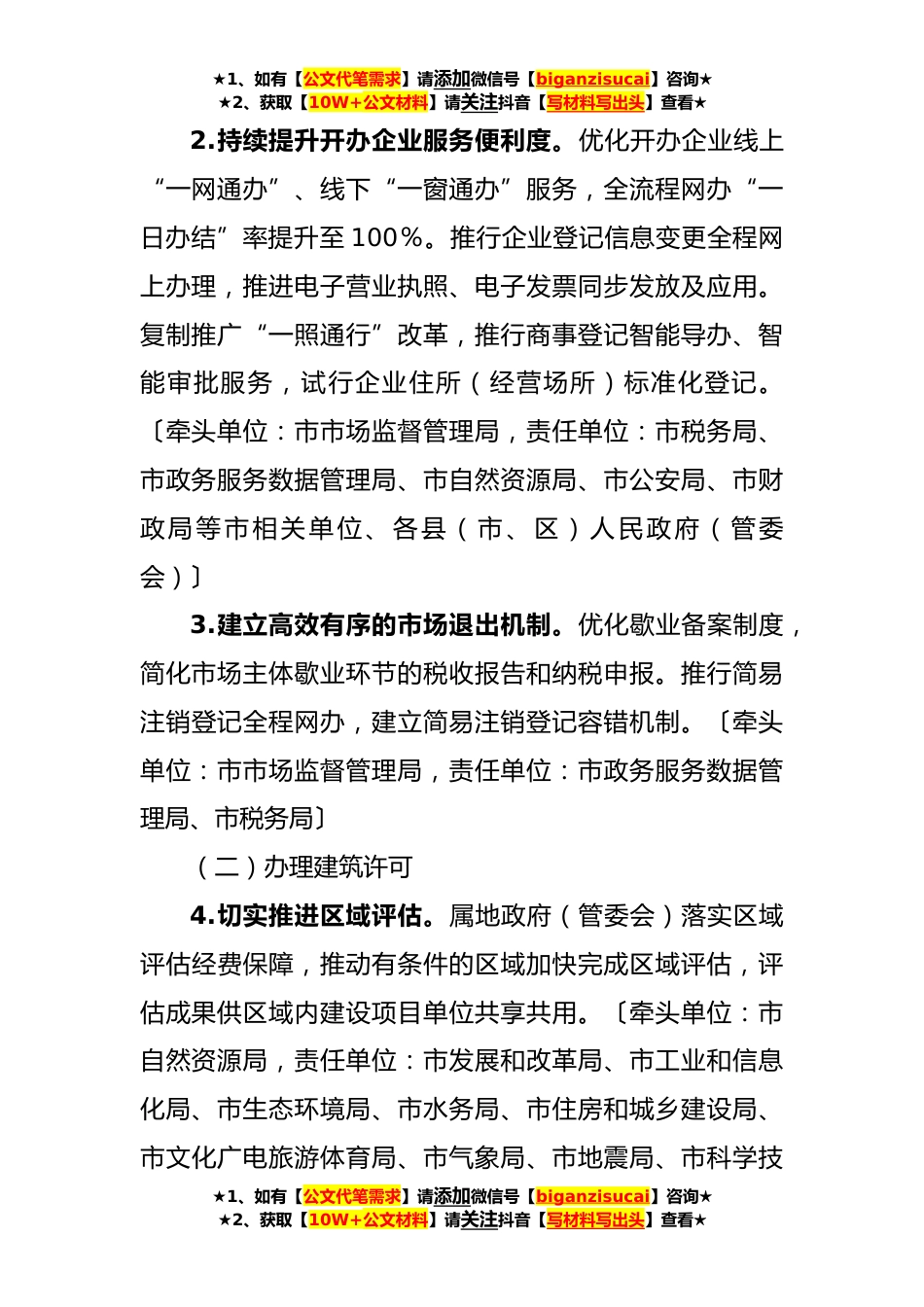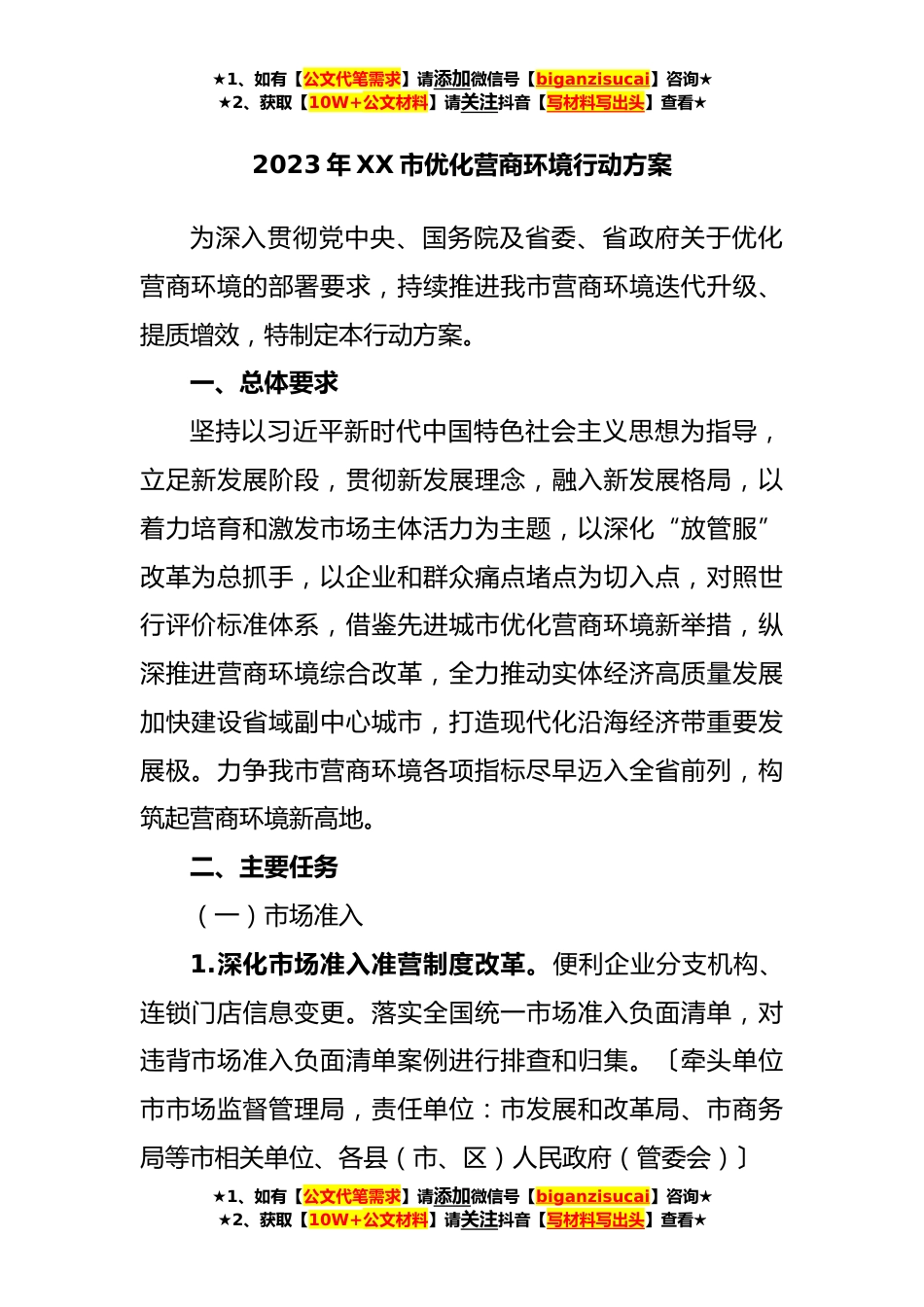 ★1、如有【公文代笔需求】请添加微信号【biganzisucai】咨询★★2、获取【10W+公文材料】请关注抖音【写材料写出头】查看★2023年XX市优化营商环境行动方案为深入贯彻党中央、国务院及省委、省政府关于优化营商环境的部署要求,持续推进我市营商环境迭代升级、提质增效,特制定本行动方案。一、总体要求坚持以习近平新时代中国特色社会主义思想为指导,立足新发展阶段,贯彻新发展理念,融入新发展格局,以着力培育和激发市场主体活力为主题,以深化“放管服”改革为总抓手,以企业和群众痛点堵点为切入点,对照世行评价标准体系,借鉴先进城市优化营商环境新举措,纵深推进营商环境综合改革,全力推动实体经济高质量发展加快建设省域副中心城市,打造现代化沿海经济带重要发展极。力争我市营商环境各项指标尽早...