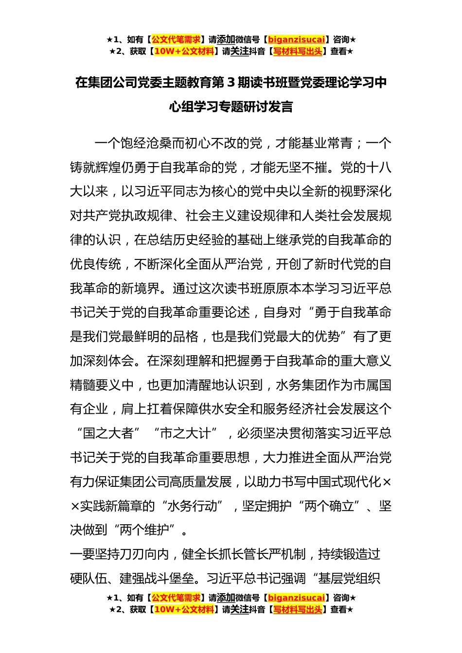 ★1、如有【公文代笔需求】请添加微信号【biganzisucai】咨询★★2、获取【10W+公文材料】请关注抖音【写材料写出头】查看★在集团公司党委主题教育第3期读书班暨党委理论学习中心组学习专题研讨发言一个饱经沧桑而初心不改的党,才能基业常青;一个铸就辉煌仍勇于自我革命的党,才能无坚不摧。党的十八大以来,以习近平同志为核心的党中央以全新的视野深化对共产党执政规律、社会主义建设规律和人类社会发展规律的认识,在总结历史经验的基础上继承党的自我革命的优良传统,不断深化全面从严治党,开创了新时代党的自我革命的新境界。通过这次读书班原原本本学习习近平总书记关于党的自我革命重要论述,自身对“勇于自我革命是我们党最鲜明的品格,也是我们党最大的优势”有了更加深刻体会。在深刻理解和把握勇于...