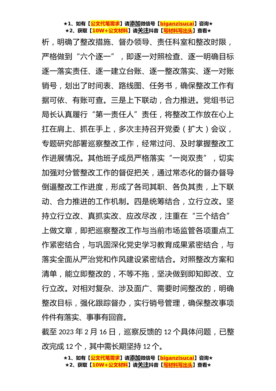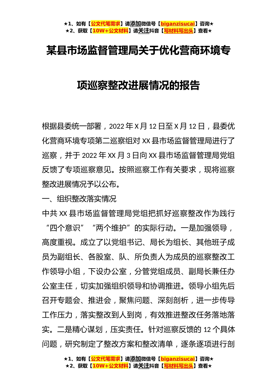 ★1、如有【公文代笔需求】请添加微信号【biganzisucai】咨询★★2、获取【10W+公文材料】请关注抖音【写材料写出头】查看★某县市场监督管理局关于优化营商环境专项巡察整改进展情况的报告根据县委统一部署,2022年X月12日至X月12日,县委优化营商环境专项第二巡察组对XX县市场监督管理局进行了巡察,并于2022年XX月3日向XX县市场监督管理局党组反馈了专项巡察意见。按照巡察工作有关要求,现将巡察整改进展情况予以公布。一、组织整改落实情况中共XX县市场监督管理局党组把抓好巡察整改作为践行“四个意识”“两个维护”的实际行动。一是加强领导,高度重视。成立了以党组书记、局长为组长、其他班子成员为副组长、各股室、队、所负责人为成员的巡察整改工作领导小组,下设办公室,分管党组成员、副局长兼任办公...