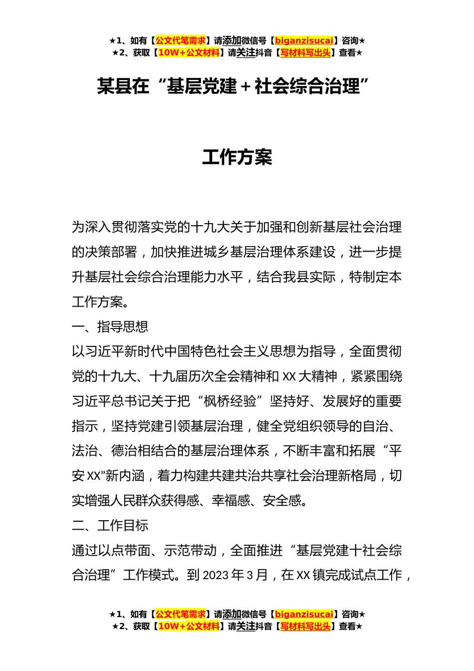 ★1、如有【公文代笔需求】请添加微信号【biganzisucai】咨询★★2、获取【10W+公文材料】请关注抖音【写材料写出头】查看★某县在“基层党建+社会综合治理”工作方案为深入贯彻落实党的十九大关于加强和创新基层社会治理的决策部署,加快推进城乡基层治理体系建设,进一步提升基层社会综合治理能力水平,结合我县实际,特制定本工作方案。一、指导思想以习近平新时代中国特色社会主义思想为指导,全面贯彻党的十九大、十九届历次全会精神和XX大精神,紧紧围绕习近平总书记关于把“枫桥经验”坚持好、发展好的重要指示,坚持党建引领基层治理,健全党组织领导的自治、法治、德治相结合的基层治理体系,不断丰富和拓展“平安XX”新内涵,着力构建共建共治共享社会治理新格局,切实增强人民群众获得感、幸福感、安...