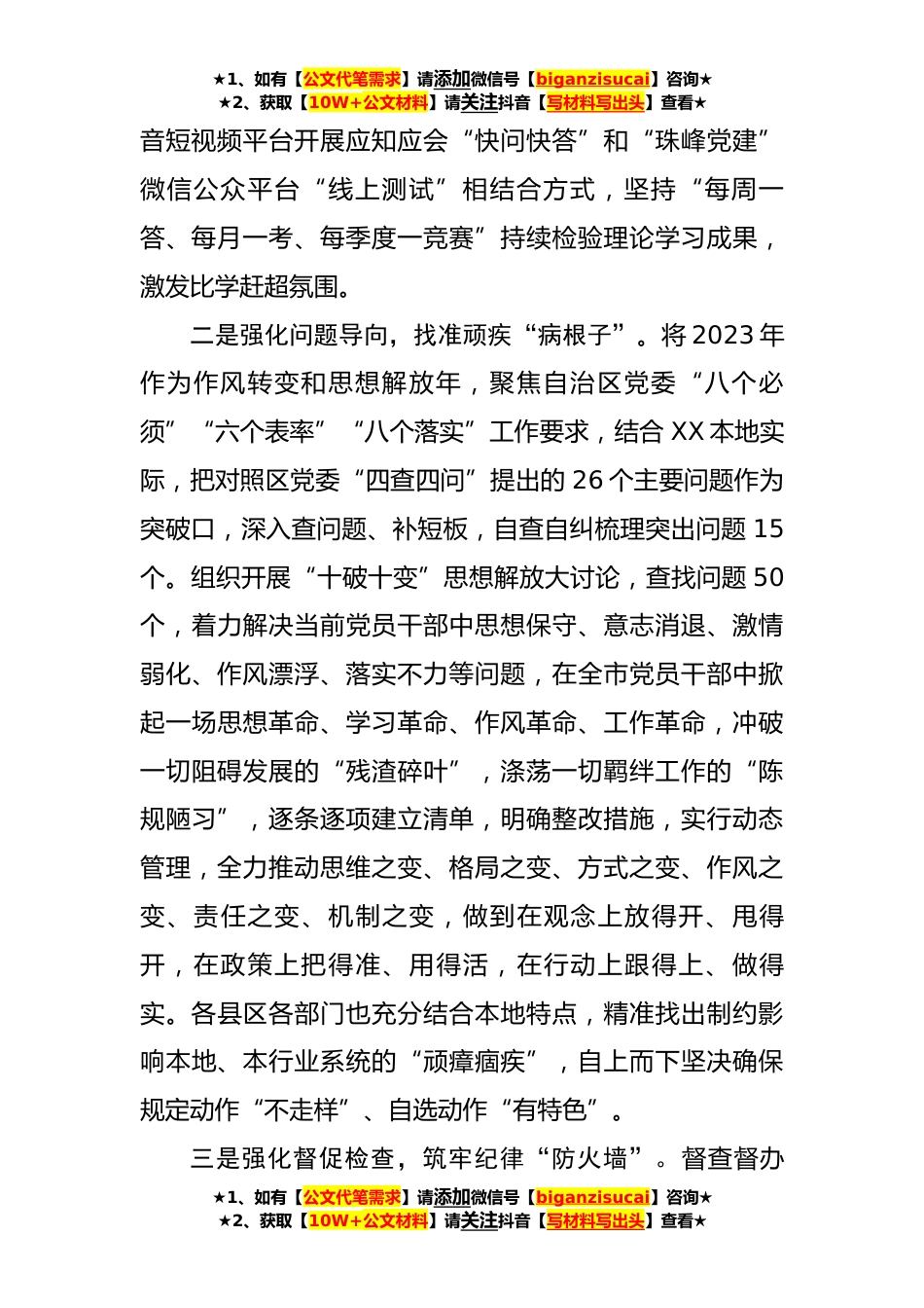 ★1、如有【公文代笔需求】请添加微信号【biganzisucai】咨询★★2、获取【10W+公文材料】请关注抖音【写材料写出头】查看★某市改进作风狠抓落实工作主要做法(1480字)自全区改进作风狠抓落实工作动员部署以来,我市深入贯彻落实自治区党委关于进一步改进作风狠抓落实工作部署要求,全市各级党委(党组)主要领导亲自谋划、亲自安排、亲自推动,高标准、严要求持续推进改进作风狠抓落实工作,确保各项重点工作任务、工作安排“件件有落实、事事有回音”,真正让党中央、区党委、市委各项决策部署在基层落地生根、开花结果。一是强化理论学习,拧紧思想“总开关”。充分发挥理论学习中心组龙头作用和基层党支部堡垒作用,坚持领导干部带头、以上率下,深入学习习近平总书记关于改进作风狠抓落实的重要论述、X在全...