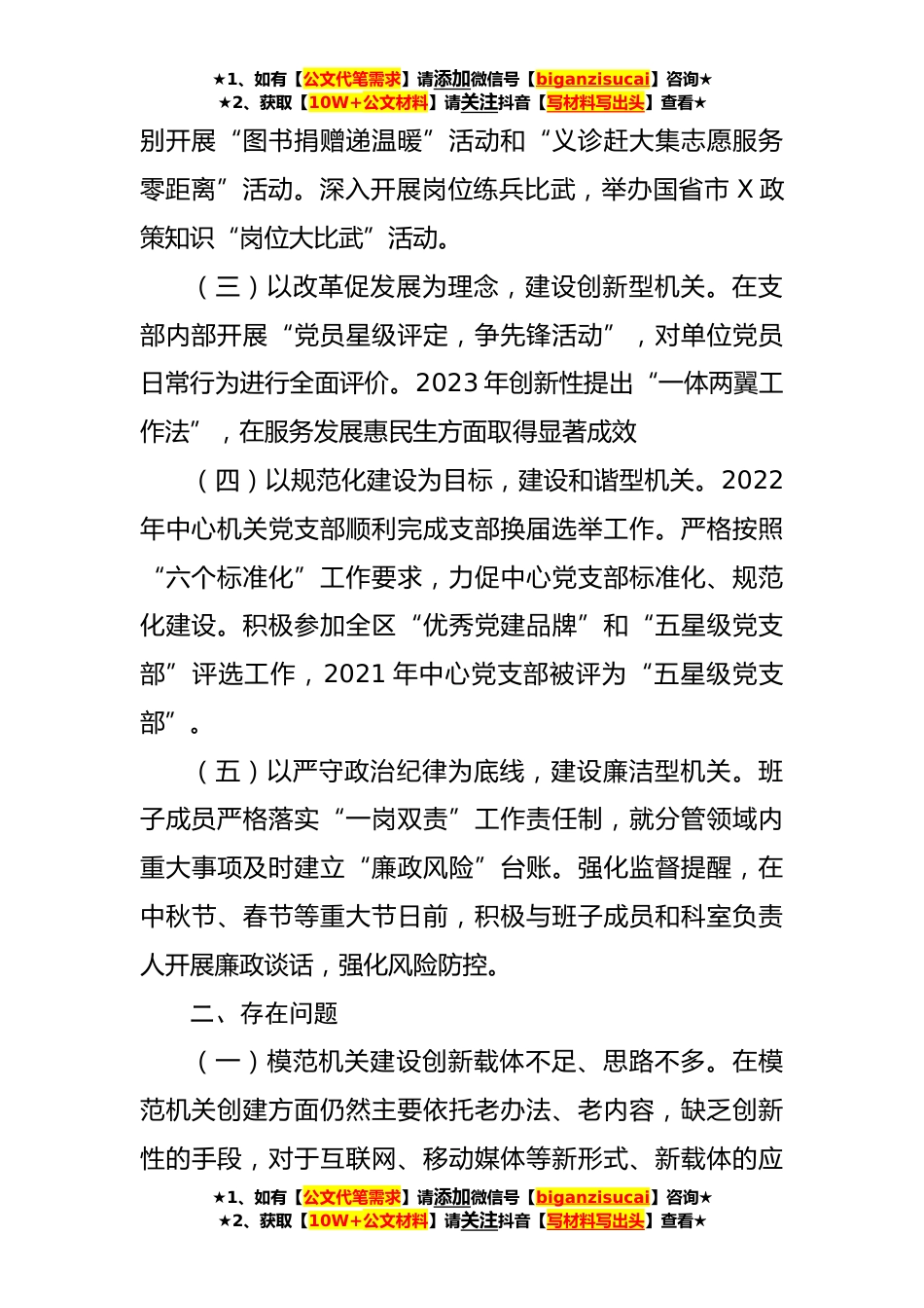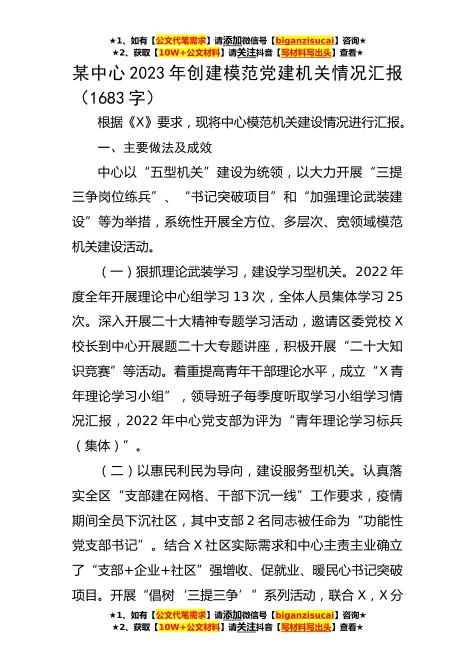 ★1、如有【公文代笔需求】请添加微信号【biganzisucai】咨询★★2、获取【10W+公文材料】请关注抖音【写材料写出头】查看★某中心2023年创建模范党建机关情况汇报(1683字)根据《X》要求,现将中心模范机关建设情况进行汇报。一、主要做法及成效中心以“五型机关”建设为统领,以大力开展“三提三争岗位练兵”、“书记突破项目”和“加强理论武装建设”等为举措,系统性开展全方位、多层次、宽领域模范机关建设活动。(一)狠抓理论武装学习,建设学习型机关。2022年度全年开展理论中心组学习13次,全体人员集体学习25次。深入开展二十大精神专题学习活动,邀请区委党校X校长到中心开展题二十大专题讲座,积极开展“二十大知识竞赛”等活动。着重提高青年干部理论水平,成立“X青年理论学习小组”,领导班子每季...