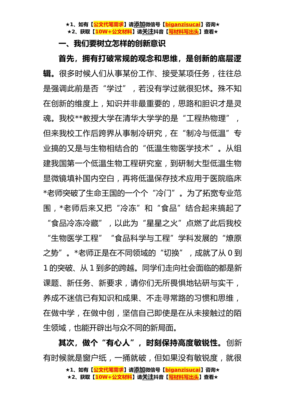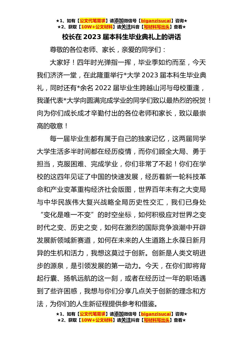 ★1、如有【公文代笔需求】请添加微信号【biganzisucai】咨询★★2、获取【10W+公文材料】请关注抖音【写材料写出头】查看★校长在2023届本科生毕业典礼上的讲话尊敬的各位老师、家长,亲爱的同学们:大家好!四年时光弹指一挥,毕业季如约而至,今天我们济济一堂,在此隆重举行*大学2023届本科生毕业典礼,同时还有*余名2022届毕业生跨越山河与母校重逢,我谨代表*大学向圆满完成学业的同学们致以最热烈的祝贺!向为你们成长成才辛勤付出的各位老师和家长,致以最崇高的敬意!每一届毕业生都有属于自己的独家记忆,这两届同学大学生活多半时间都在经历疫情,而你们顾全大局、勇于担当,克服困难、完成学业,你们非常了不起!你们在学校的这四年见证了中国的快速发展,经历着新一轮科技革命和产业变革重构经济社会...