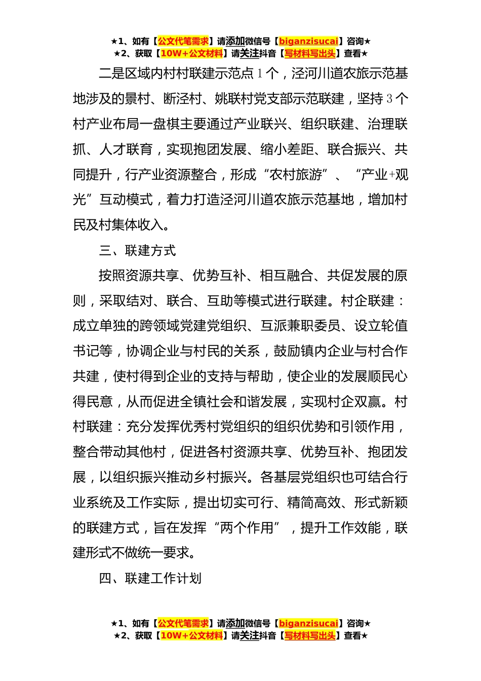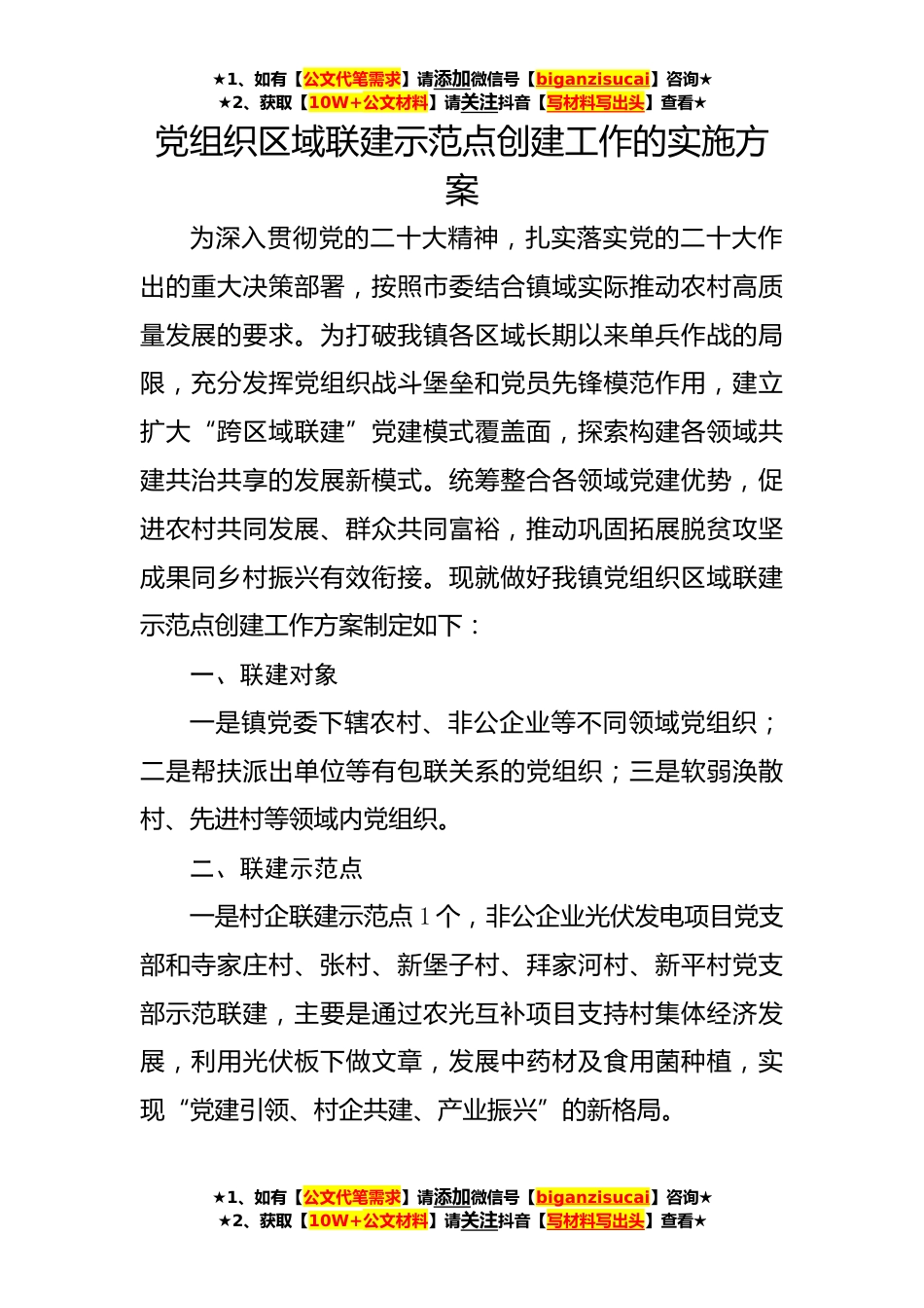 ★1、如有【公文代笔需求】请添加微信号【biganzisucai】咨询★★2、获取【10W+公文材料】请关注抖音【写材料写出头】查看★党组织区域联建示范点创建工作的实施方案为深入贯彻党的二十大精神,扎实落实党的二十大作出的重大决策部署,按照市委结合镇域实际推动农村高质量发展的要求。为打破我镇各区域长期以来单兵作战的局限,充分发挥党组织战斗堡垒和党员先锋模范作用,建立扩大“跨区域联建”党建模式覆盖面,探索构建各领域共建共治共享的发展新模式。统筹整合各领域党建优势,促进农村共同发展、群众共同富裕,推动巩固拓展脱贫攻坚成果同乡村振兴有效衔接。现就做好我镇党组织区域联建示范点创建工作方案制定如下:一、联建对象一是镇党委下辖农村、非公企业等不同领域党组织;二是帮扶派出单位等有包联关...