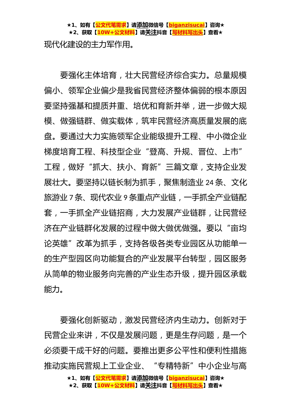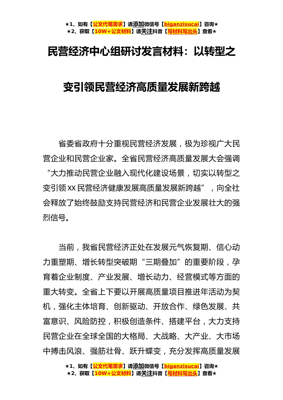 ★1、如有【公文代笔需求】请添加微信号【biganzisucai】咨询★★2、获取【10W+公文材料】请关注抖音【写材料写出头】查看★民营经济中心组研讨发言材料:以转型之变引领民营经济高质量发展新跨越省委省政府十分重视民营经济发展,极为珍视广大民营企业和民营企业家。全省民营经济高质量发展大会强调“大力推动民营企业融入现代化建设场景,切实以转型之变引领XX民营经济健康发展高质量发展新跨越”,向全社会释放了始终鼓励支持民营经济和民营企业发展壮大的强烈信号。当前,我省民营经济正处在发展元气恢复期、信心动力重塑期、增长转型突破期“三期叠加”的重要阶段,孕育着企业制度、产业发展、增长动力、经营模式等方面的重大转变。全省上下要以开展高质量项目推进年活动为契机,强化主体培育、创新驱动、开...