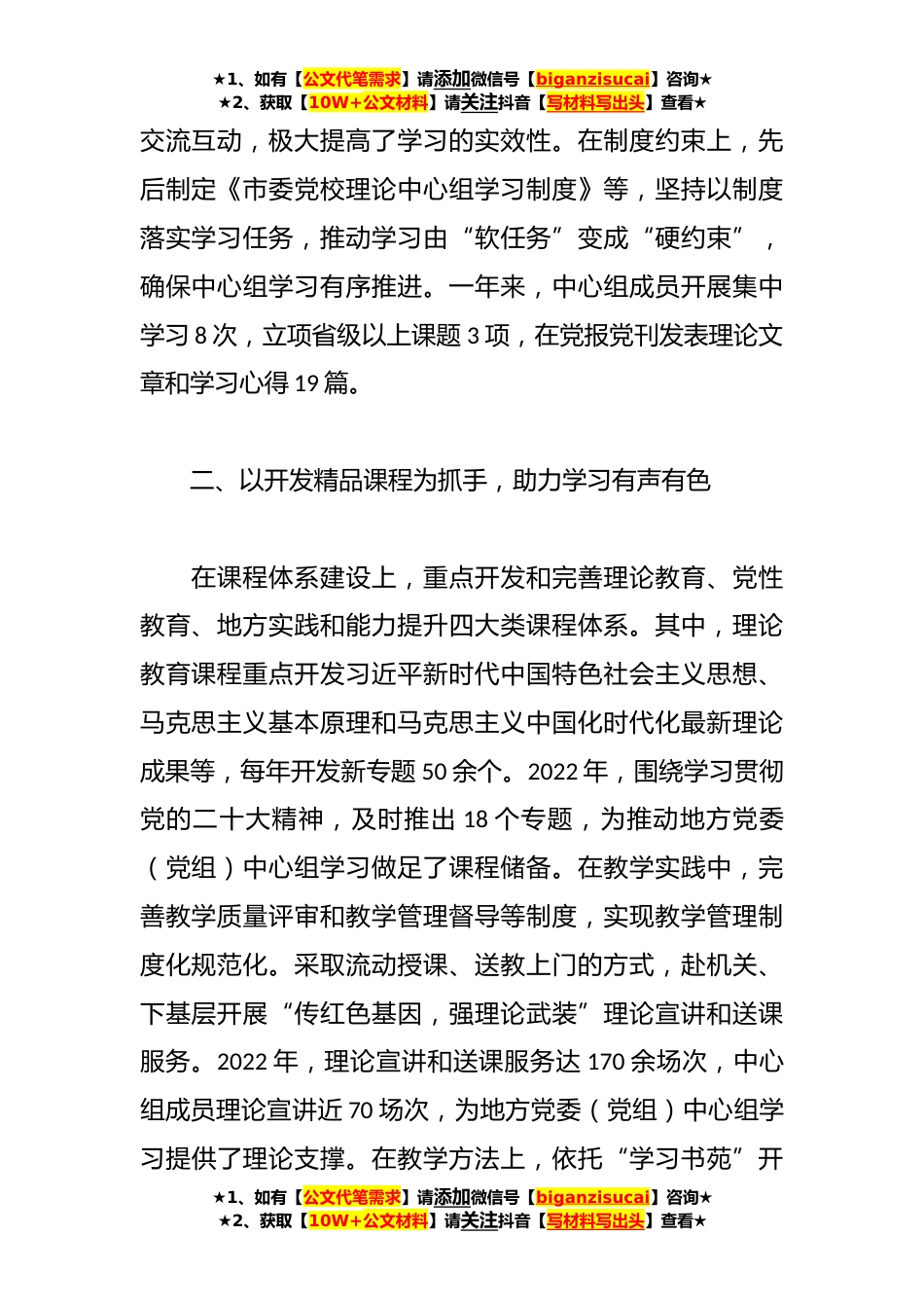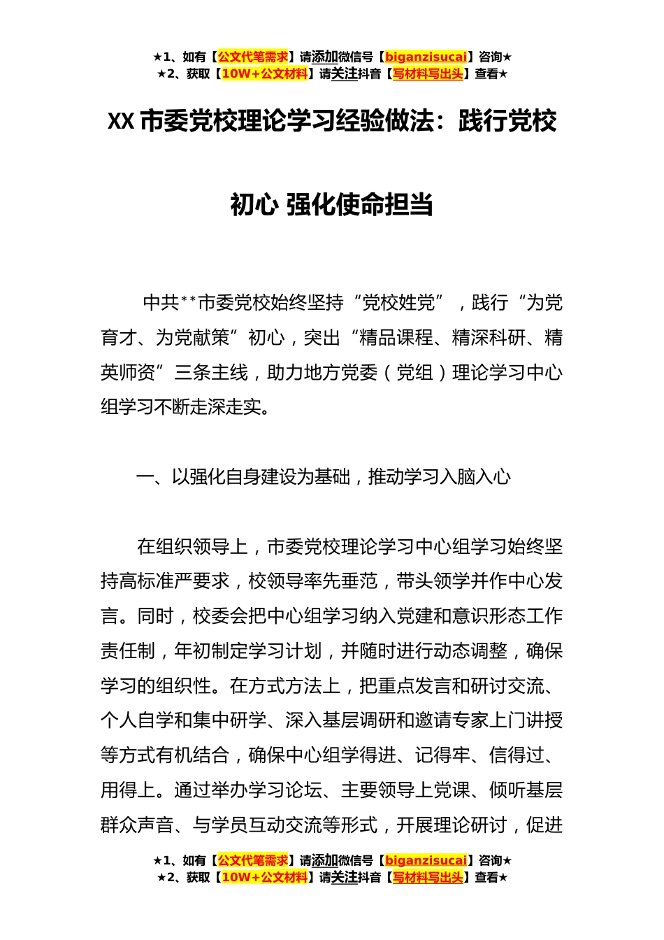 ★1、如有【公文代笔需求】请添加微信号【biganzisucai】咨询★★2、获取【10W+公文材料】请关注抖音【写材料写出头】查看★XX市委党校理论学习经验做法:践行党校初心强化使命担当中共**市委党校始终坚持“党校姓党”,践行“为党育才、为党献策”初心,突出“精品课程、精深科研、精英师资”三条主线,助力地方党委(党组)理论学习中心组学习不断走深走实。一、以强化自身建设为基础,推动学习入脑入心在组织领导上,市委党校理论学习中心组学习始终坚持高标准严要求,校领导率先垂范,带头领学并作中心发言。同时,校委会把中心组学习纳入党建和意识形态工作责任制,年初制定学习计划,并随时进行动态调整,确保学习的组织性。在方式方法上,把重点发言和研讨交流、个人自学和集中研学、深入基层调研和邀请专...