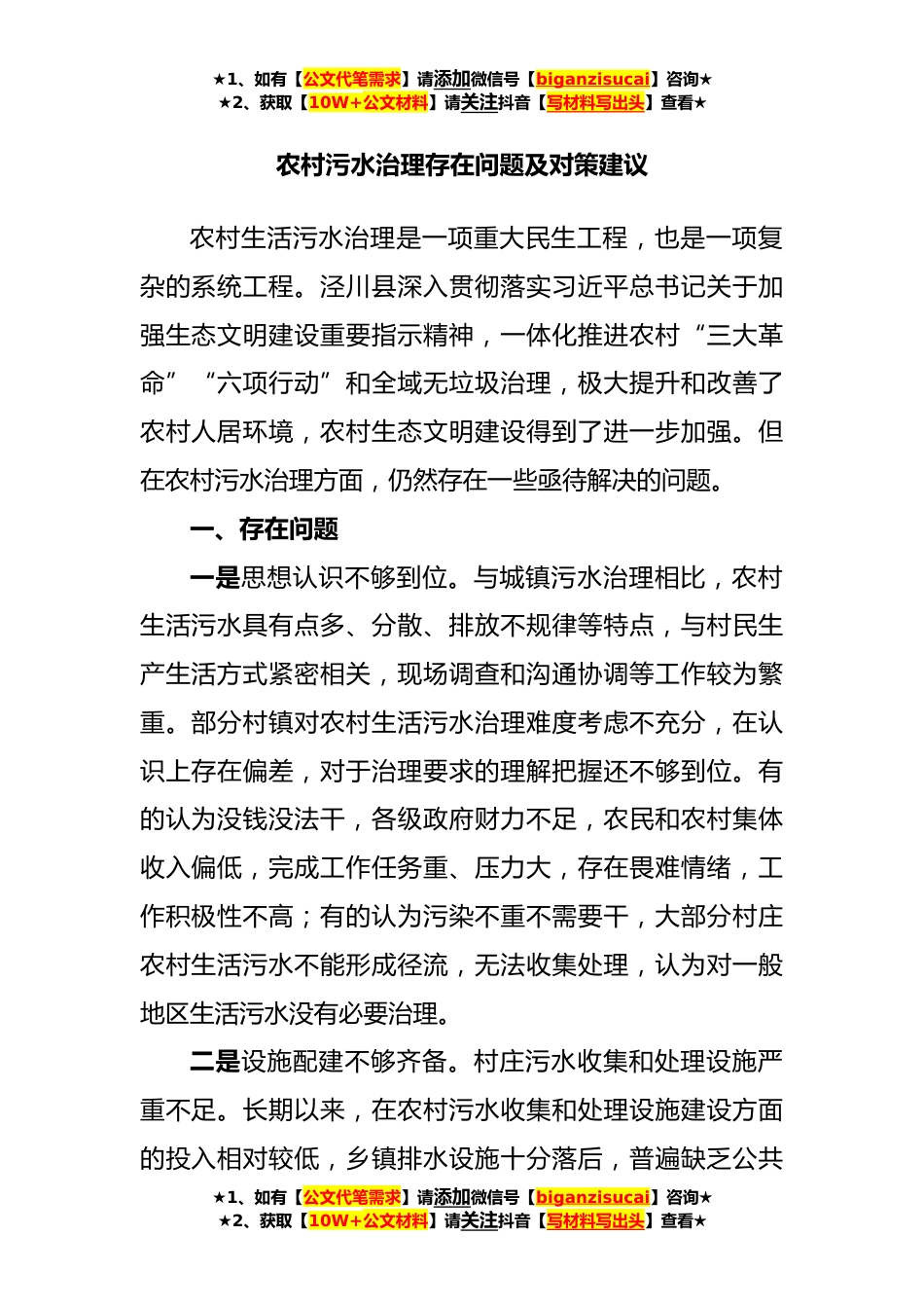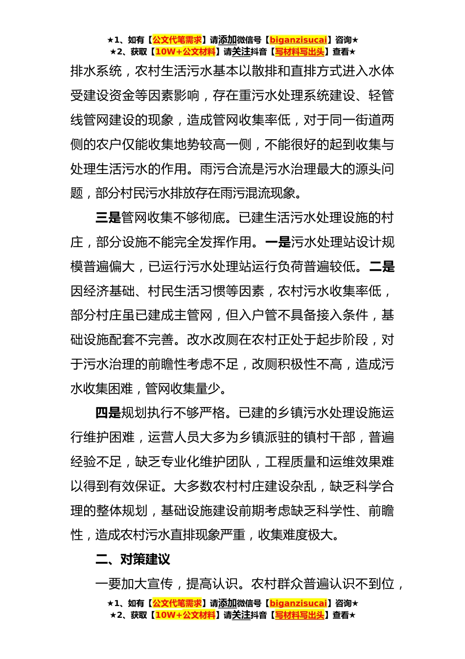 ★1、如有【公文代笔需求】请添加微信号【biganzisucai】咨询★★2、获取【10W+公文材料】请关注抖音【写材料写出头】查看★农村污水治理存在问题及对策建议农村生活污水治理是一项重大民生工程,也是一项复杂的系统工程。泾川县深入贯彻落实习近平总书记关于加强生态文明建设重要指示精神,一体化推进农村“三大革命”“六项行动”和全域无垃圾治理,极大提升和改善了农村人居环境,农村生态文明建设得到了进一步加强。但在农村污水治理方面,仍然存在一些亟待解决的问题。一、存在问题一是思想认识不够到位。与城镇污水治理相比,农村生活污水具有点多、分散、排放不规律等特点,与村民生产生活方式紧密相关,现场调查和沟通协调等工作较为繁重。部分村镇对农村生活污水治理难度考虑不充分,在认识上存在偏差,...