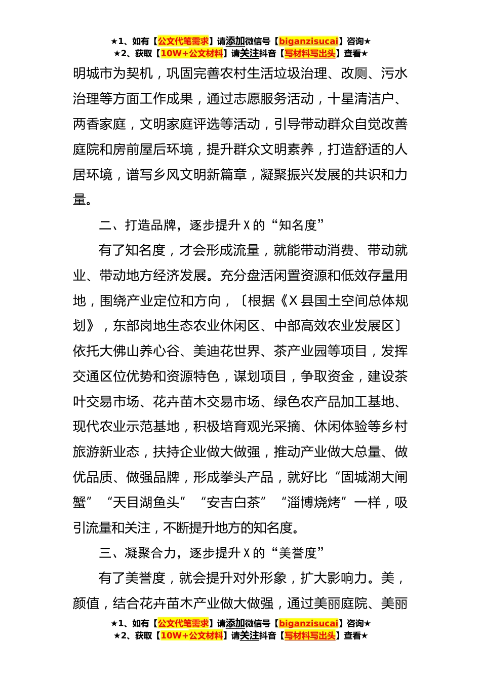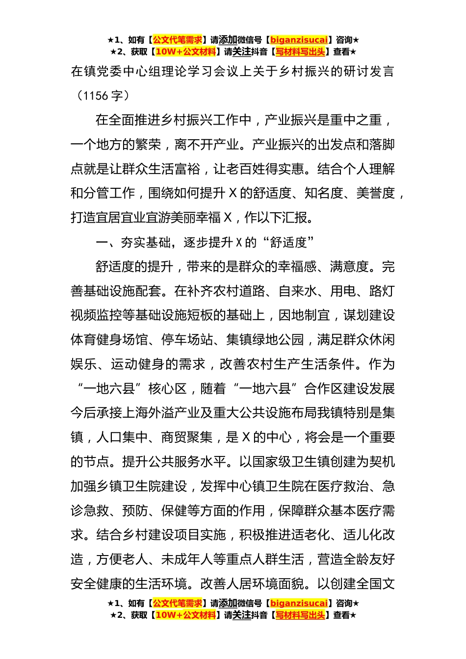 ★1、如有【公文代笔需求】请添加微信号【biganzisucai】咨询★★2、获取【10W+公文材料】请关注抖音【写材料写出头】查看★在镇党委中心组理论学习会议上关于乡村振兴的研讨发言(1156字)在全面推进乡村振兴工作中,产业振兴是重中之重,一个地方的繁荣,离不开产业。产业振兴的出发点和落脚点就是让群众生活富裕,让老百姓得实惠。结合个人理解和分管工作,围绕如何提升X的舒适度、知名度、美誉度,打造宜居宜业宜游美丽幸福X,作以下汇报。一、夯实基础,逐步提升X的“舒适度”舒适度的提升,带来的是群众的幸福感、满意度。完善基础设施配套。在补齐农村道路、自来水、用电、路灯视频监控等基础设施短板的基础上,因地制宜,谋划建设体育健身场馆、停车场站、集镇绿地公园,满足群众休闲娱乐、运动健身的需求...