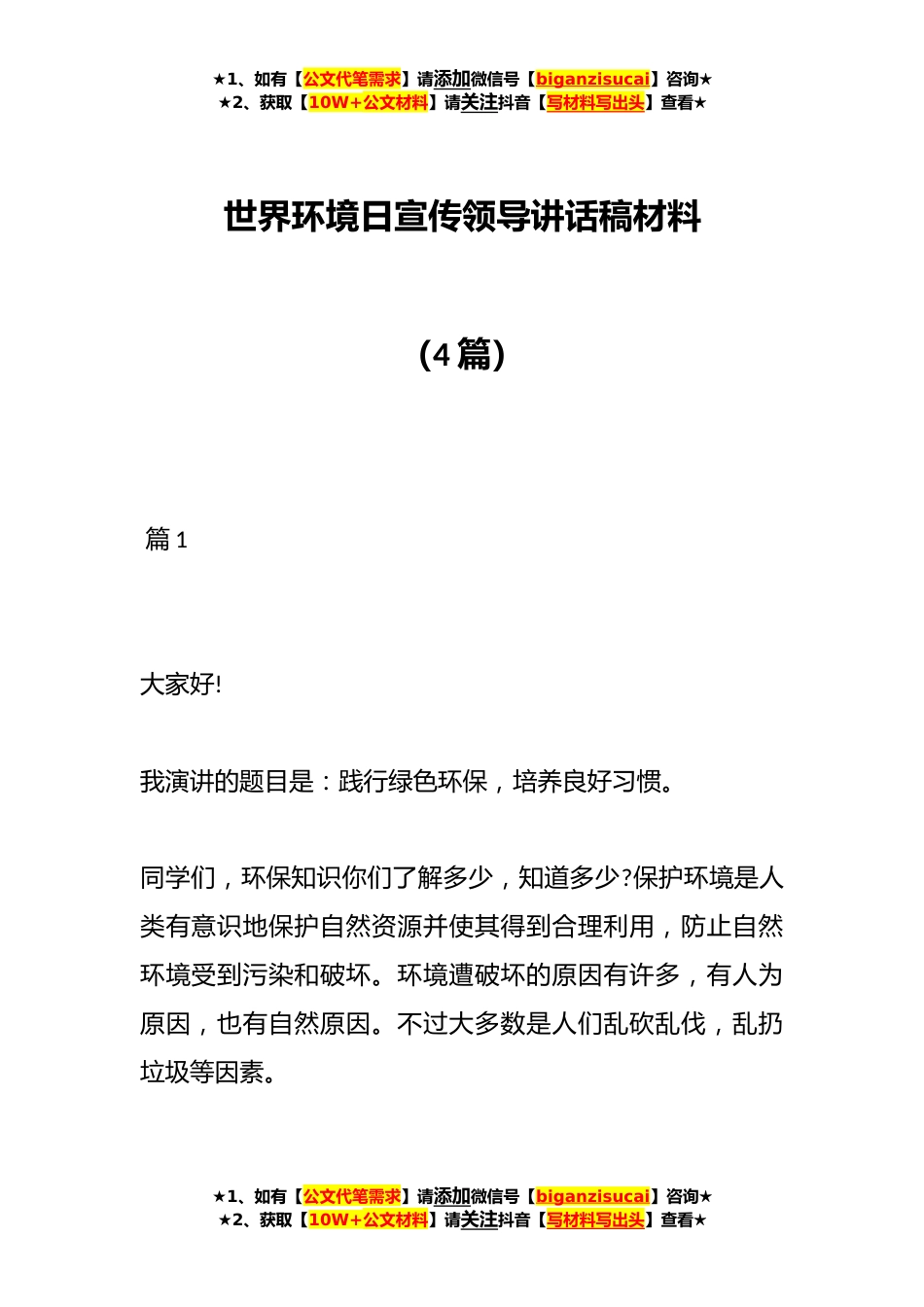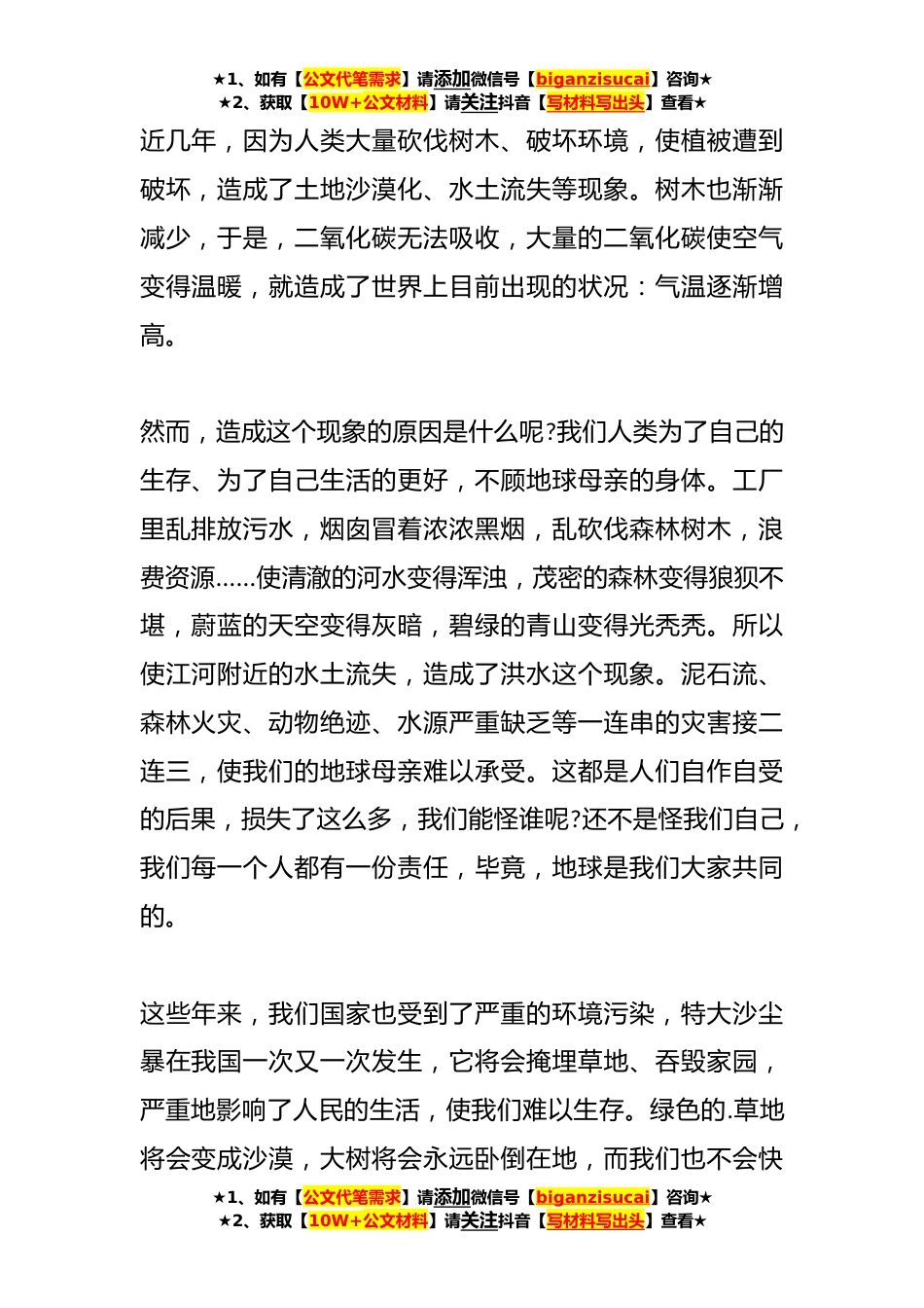 ★1、如有【公文代笔需求】请添加微信号【biganzisucai】咨询★★2、获取【10W+公文材料】请关注抖音【写材料写出头】查看★世界环境日宣传领导讲话稿材料(4篇)篇1大家好!我演讲的题目是:践行绿色环保,培养良好习惯。同学们,环保知识你们了解多少,知道多少?保护环境是人类有意识地保护自然资源并使其得到合理利用,防止自然环境受到污染和破坏。环境遭破坏的原因有许多,有人为原因,也有自然原因。不过大多数是人们乱砍乱伐,乱扔垃圾等因素。★1、如有【公文代笔需求】请添加微信号【biganzisucai】咨询★★2、获取【10W+公文材料】请关注抖音【写材料写出头】查看★★1、如有【公文代笔需求】请添加微信号【biganzisucai】咨询★★2、获取【10W+公文材料】请关注抖音【写材料写出头】查看★近几年,因为...