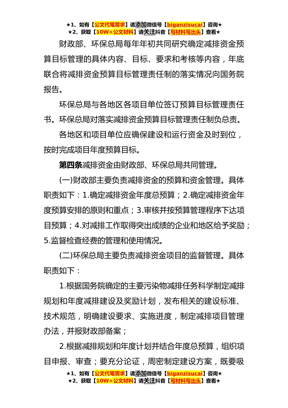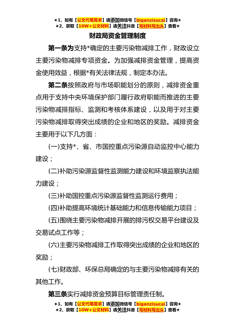 ★1、如有【公文代笔需求】请添加微信号【biganzisucai】咨询★★2、获取【10W+公文材料】请关注抖音【写材料写出头】查看★财政局资金管理制度第一条为支持*确定的主要污染物减排工作,财政设立主要污染物减排专项资金。为加强减排资金管理,提高资金使用效益,根据*有关法律法规,制定本办法。第二条按照政府与市场职能划分的原则,减排资金重点用于支持中央环境保护部门履行政府职能而推进的主要污染物减排指标、监测和考核体系建设,以及用于对主要污染物减排取得突出成绩的企业和地区的奖励。减排资金主要用于以下几方面:(一)支持*、省、市国控重点污染源自动监控中心能力建设;(二)补助污染源监督性监测能力建设和环境监察执法能力建设;(三)补助国控重点污染源监督性监测运行费用;(四)补助提高环境统计基...