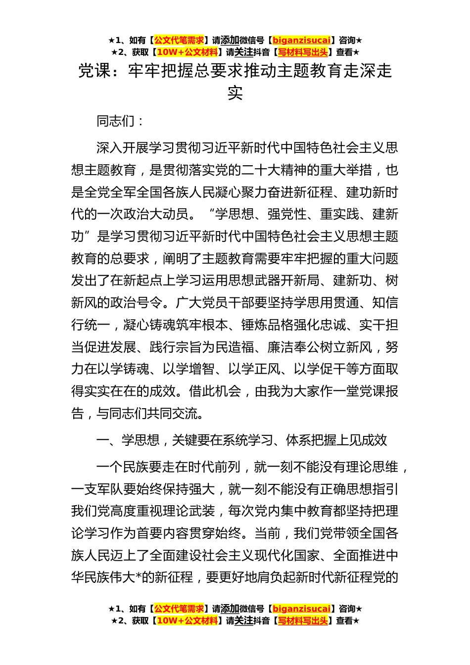 ★1、如有【公文代笔需求】请添加微信号【biganzisucai】咨询★★2、获取【10W+公文材料】请关注抖音【写材料写出头】查看★★1、如有【公文代笔需求】请添加微信号【biganzisucai】咨询★★2、获取【10W+公文材料】请关注抖音【写材料写出头】查看★★1、如有【公文代笔需求】请添加微信号【biganzisucai】咨询★★2、获取【10W+公文材料】请关注抖音【写材料写出头】查看★党课:牢牢把握总要求推动主题教育走深走实同志们:深入开展学习贯彻习近平新时代中国特色社会主义思想主题教育,是贯彻落实党的二十大精神的重大举措,也是全党全军全国各族人民凝心聚力奋进新征程、建功新时代的一次政治大动员。“学思想、强党性、重实践、建新功”是学习贯彻习近平新时代中国特色社会主义思想主题教育的总要求,阐明了...
