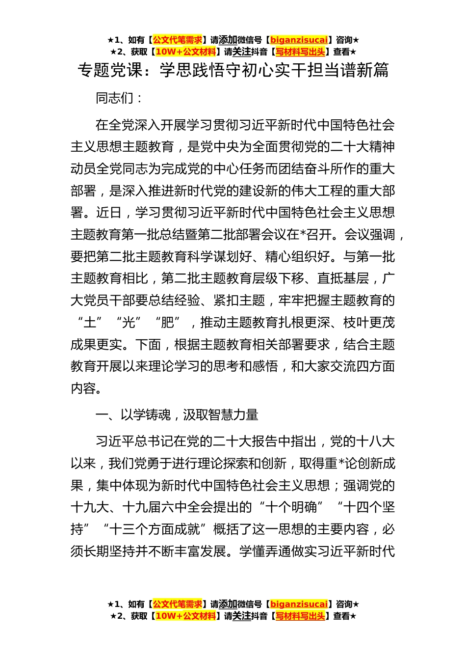 ★1、如有【公文代笔需求】请添加微信号【biganzisucai】咨询★★2、获取【10W+公文材料】请关注抖音【写材料写出头】查看★★1、如有【公文代笔需求】请添加微信号【biganzisucai】咨询★★2、获取【10W+公文材料】请关注抖音【写材料写出头】查看★★1、如有【公文代笔需求】请添加微信号【biganzisucai】咨询★★2、获取【10W+公文材料】请关注抖音【写材料写出头】查看★专题党课:学思践悟守初心实干担当谱新篇同志们:在全党深入开展学习贯彻习近平新时代中国特色社会主义思想主题教育,是党中央为全面贯彻党的二十大精神动员全党同志为完成党的中心任务而团结奋斗所作的重大部署,是深入推进新时代党的建设新的伟大工程的重大部署。近日,学习贯彻习近平新时代中国特色社会主义思想主题教育第一批总结暨第...