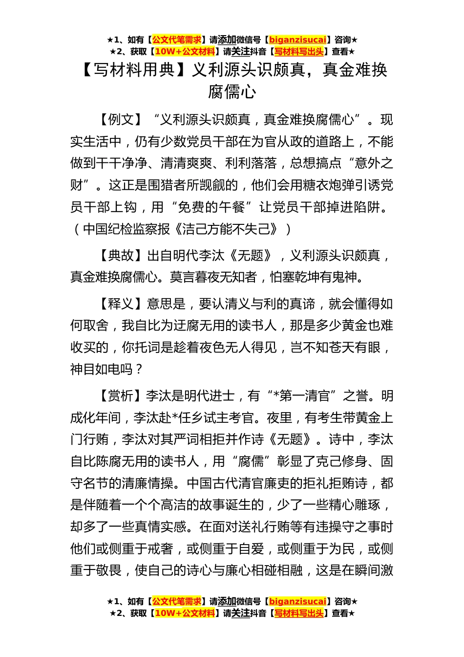★1、如有【公文代笔需求】请添加微信号【biganzisucai】咨询★★2、获取【10W+公文材料】请关注抖音【写材料写出头】查看★★1、如有【公文代笔需求】请添加微信号【biganzisucai】咨询★★2、获取【10W+公文材料】请关注抖音【写材料写出头】查看★★1、如有【公文代笔需求】请添加微信号【biganzisucai】咨询★★2、获取【10W+公文材料】请关注抖音【写材料写出头】查看★【写材料用典】义利源头识颇真,真金难换腐儒心【例文】“义利源头识颇真,真金难换腐儒心”。现实生活中,仍有少数党员干部在为官从政的道路上,不能做到干干净净、清清爽爽、利利落落,总想搞点“意外之财”。这正是围猎者所觊觎的,他们会用糖衣炮弹引诱党员干部上钩,用“免费的午餐”让党员干部掉进陷阱。(中国纪检监察报《洁己方能...
