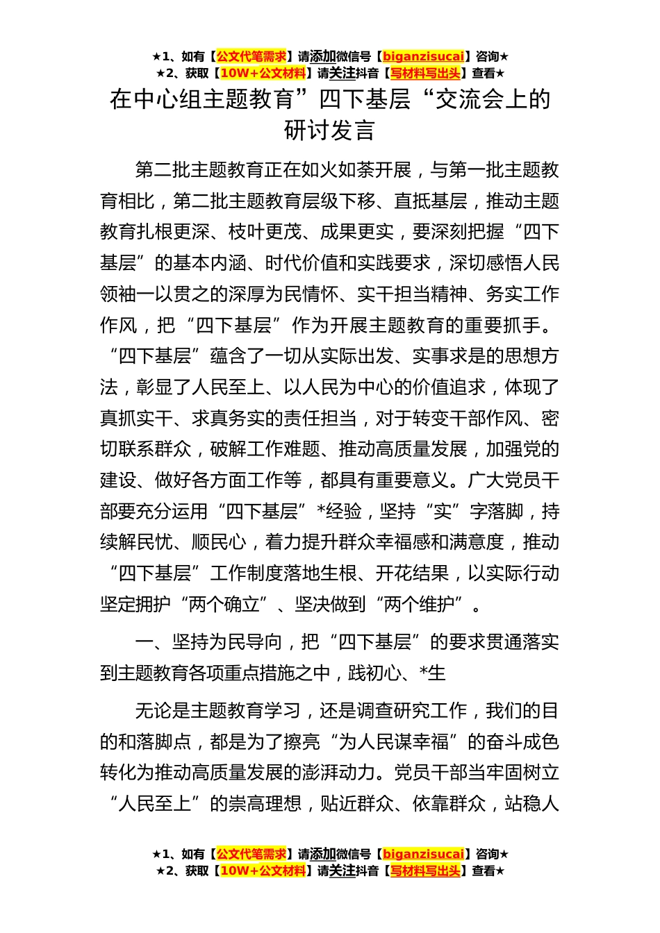 ★1、如有【公文代笔需求】请添加微信号【biganzisucai】咨询★★2、获取【10W+公文材料】请关注抖音【写材料写出头】查看★★1、如有【公文代笔需求】请添加微信号【biganzisucai】咨询★★2、获取【10W+公文材料】请关注抖音【写材料写出头】查看★★1、如有【公文代笔需求】请添加微信号【biganzisucai】咨询★★2、获取【10W+公文材料】请关注抖音【写材料写出头】查看★在中心组主题教育”四下基层“交流会上的研讨发言第二批主题教育正在如火如荼开展,与第一批主题教育相比,第二批主题教育层级下移、直抵基层,推动主题教育扎根更深、枝叶更茂、成果更实,要深刻把握“四下基层”的基本内涵、时代价值和实践要求,深切感悟人民领袖一以贯之的深厚为民情怀、实干担当精神、务实工作作风,把“四下基层”作...