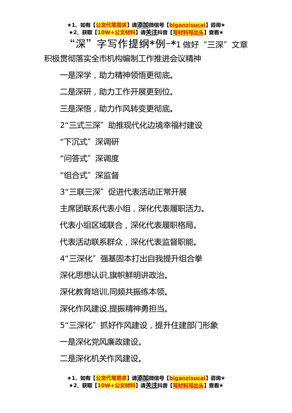 ★1、如有【公文代笔需求】请添加微信号【biganzisucai】咨询★★2、获取【10W+公文材料】请关注抖音【写材料写出头】查看★★1、如有【公文代笔需求】请添加微信号【biganzisucai】咨询★★2、获取【10W+公文材料】请关注抖音【写材料写出头】查看★★1、如有【公文代笔需求】请添加微信号【biganzisucai】咨询★★2、获取【10W+公文材料】请关注抖音【写材料写出头】查看★“深”字写作提纲*例-*1做好“三深”文章积极贯彻落实全市机构编制工作推进会议精神一是深学,助力精神领悟更彻底。二是深研,助力工作开展更到位。三是深悟,助力作风转变更彻底。2“三式三深”助推现代化边境幸福村建设“下沉式”深调研“问答式”深调度“组合式”深监督3“三联三深”促进代表活动正常开展主席团联系代表小组,深化代表...